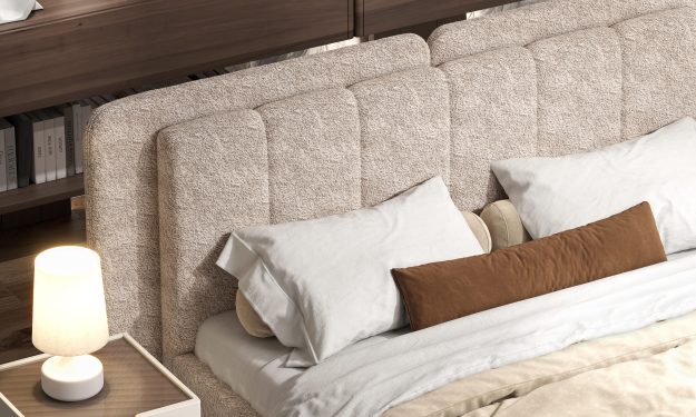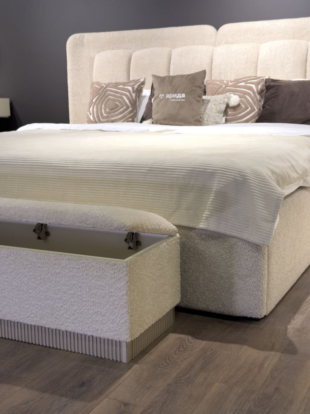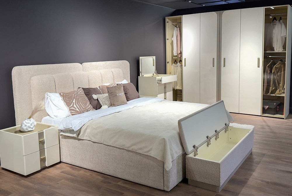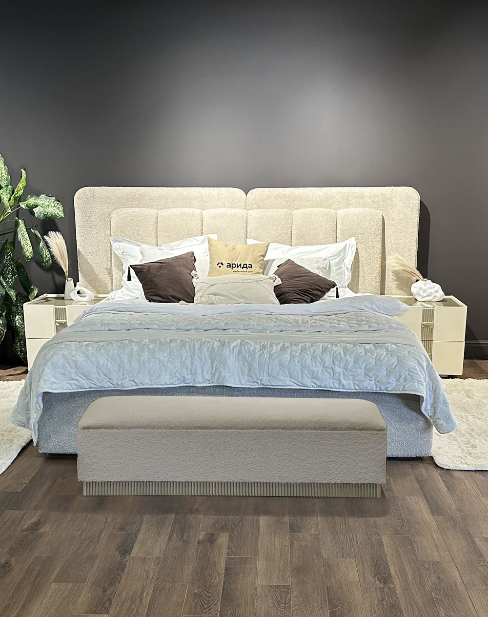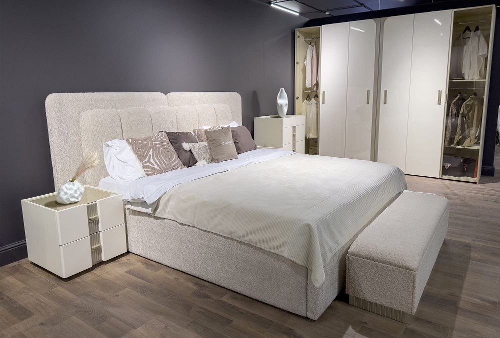 Мягкое изголовье, выполненное в ткани букле, притягивает взгляд своей текстурой и глубиной, добавляя интерьеру современный шик и благородство. Его двойная форма, актуальная и трендовая, подчёркивает индивидуальность гарнитура, делая его не просто мебелью, а настоящим акцентом, который говорит о вашем безупречном вкусе.