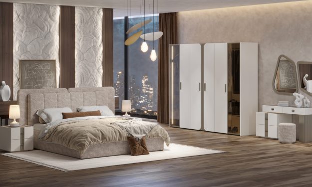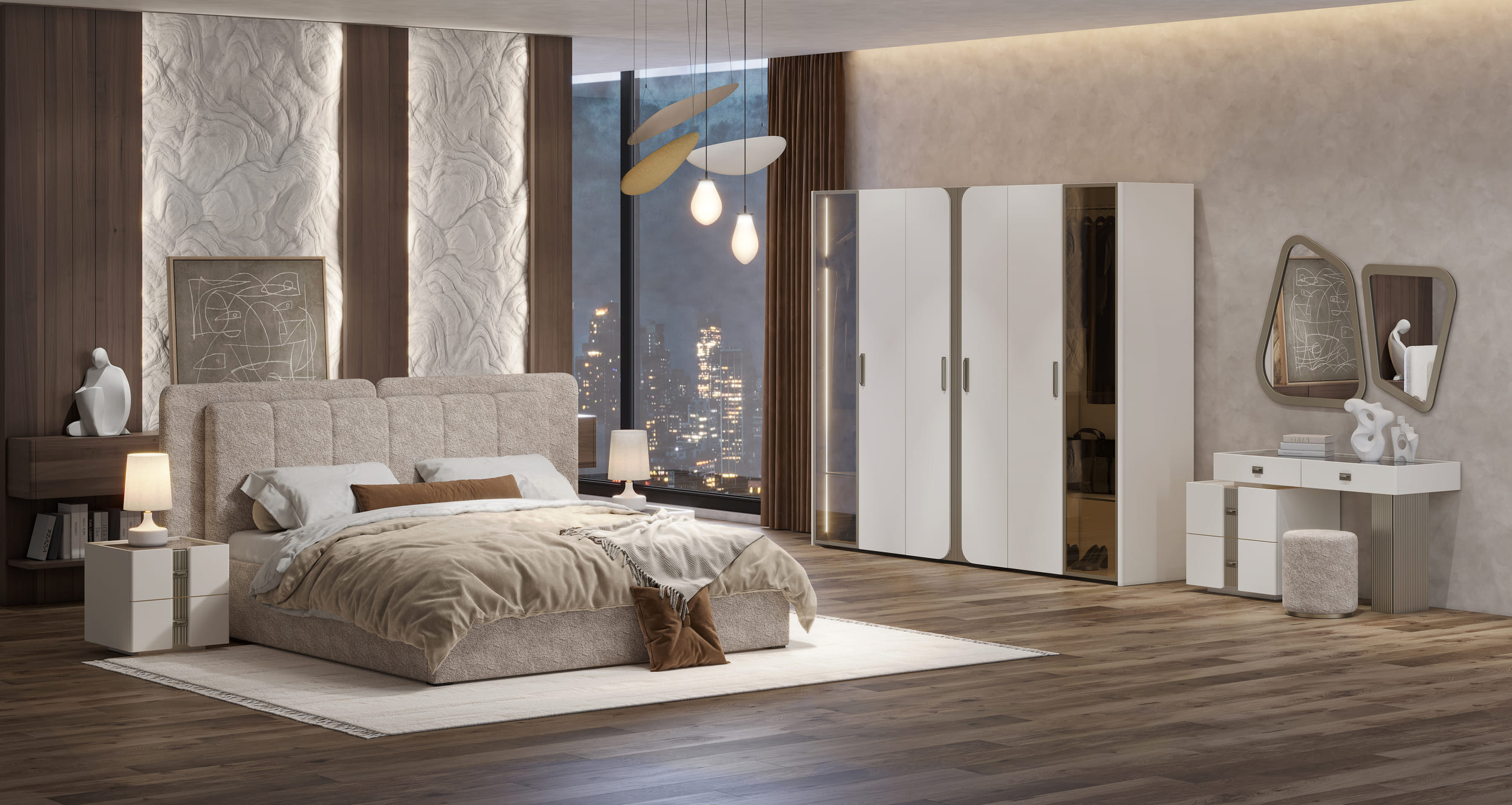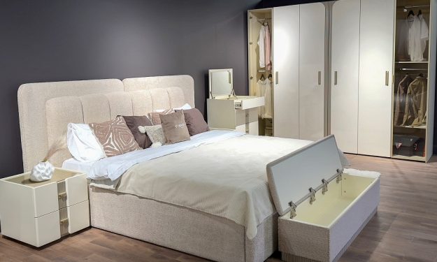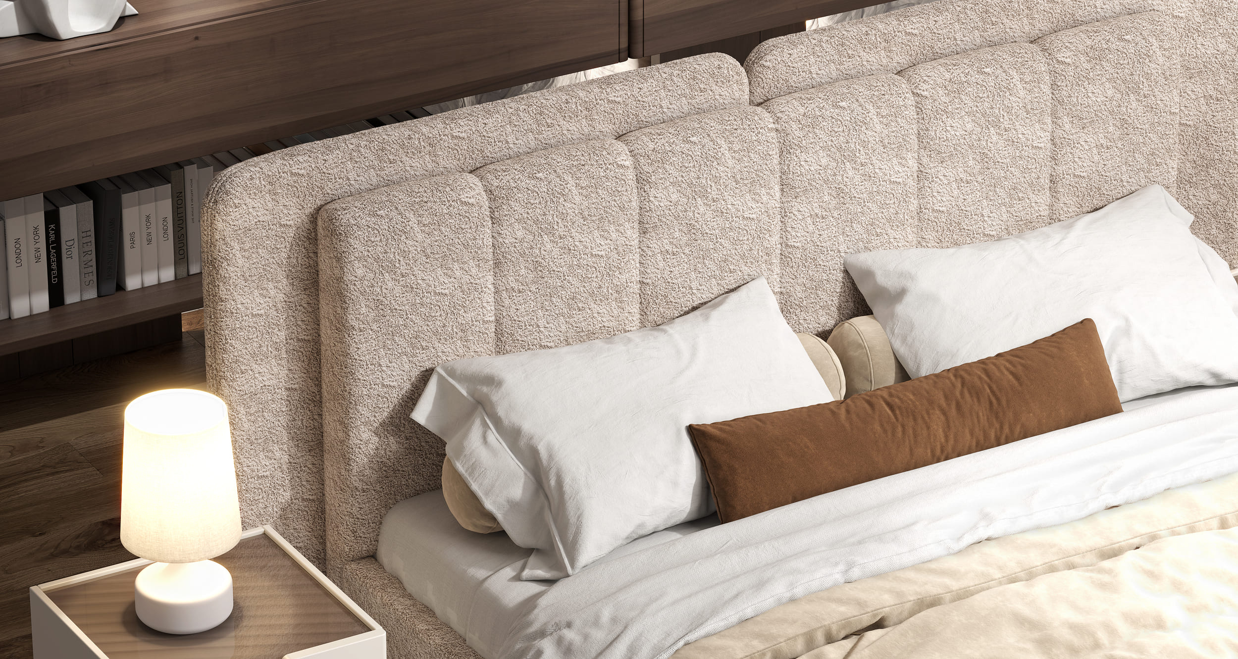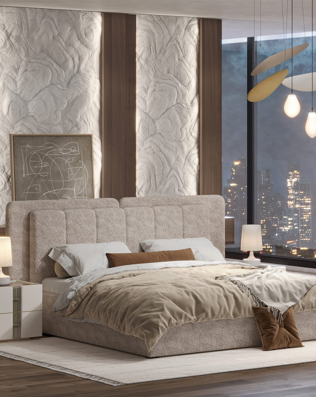 Мягкое изголовье, выполненное в ткани букле, притягивает взгляд своей текстурой и глубиной, добавляя интерьеру современный шик и благородство. Его двойная форма, актуальная и трендовая, подчёркивает индивидуальность гарнитура, делая его не просто мебелью, а настоящим акцентом, который говорит о вашем безупречном вкусе.
