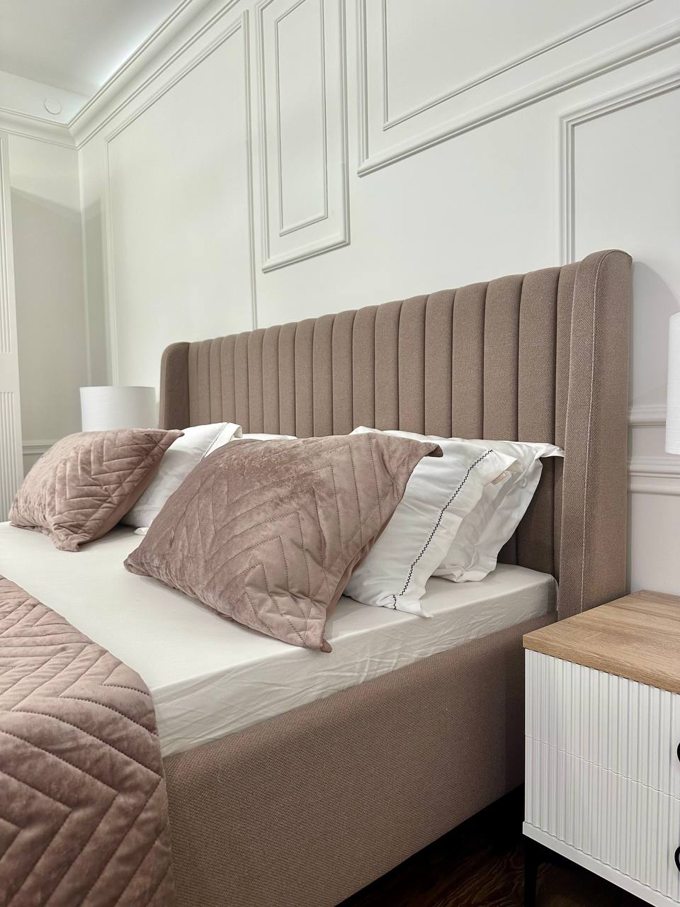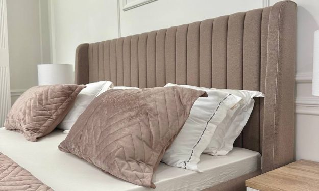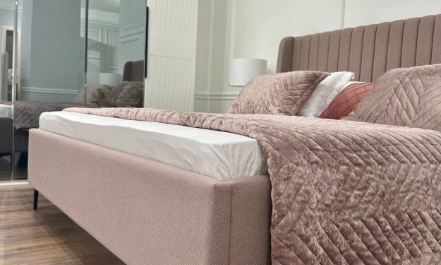 - Изголовье: ЛДСП в ткани Премиум велюр, поперечная стяжка, форма изголовья с бортиками;