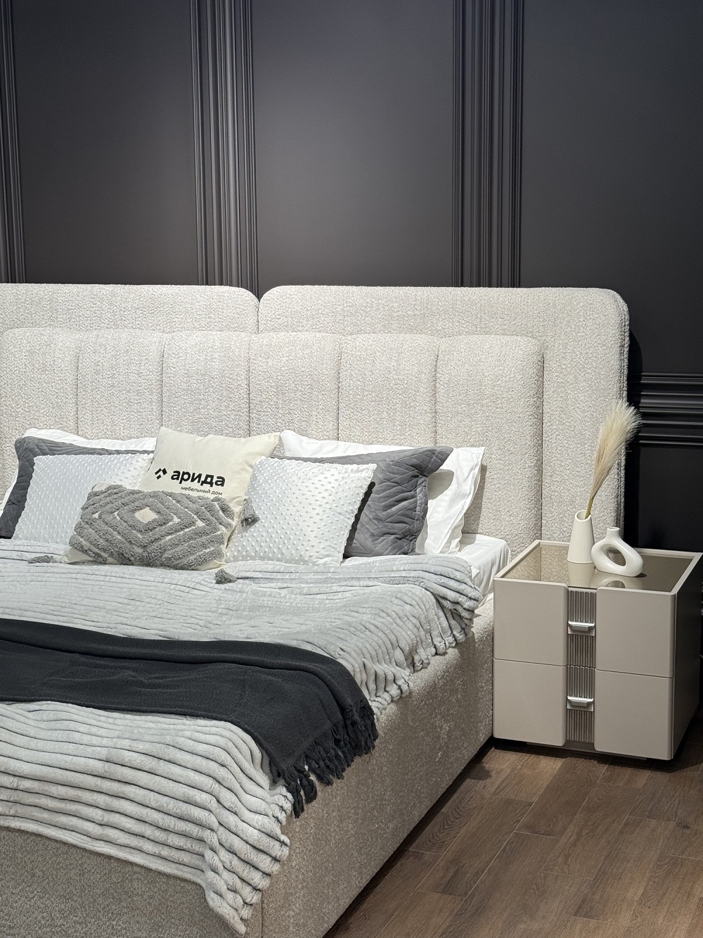 Мягкое изголовье, выполненное в ткани букле, притягивает взгляд своей текстурой и глубиной, добавляя интерьеру современный шик и благородство. Его двойная форма, актуальная и трендовая, подчёркивает индивидуальность гарнитура, делая его не просто мебелью, а настоящим акцентом, который говорит о вашем безупречном вкусе.