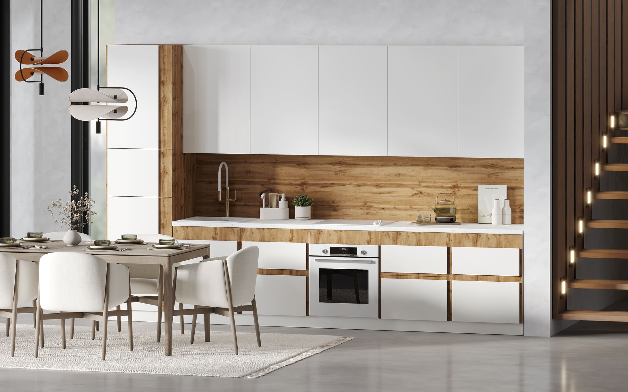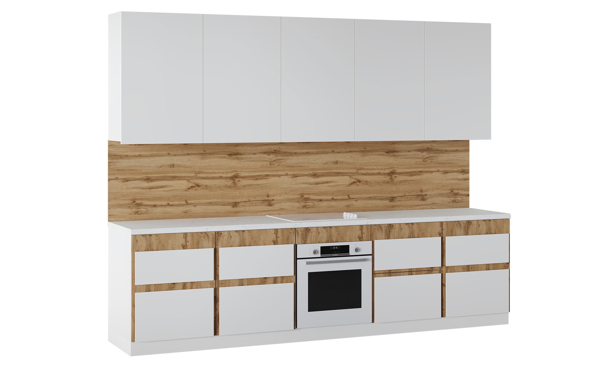 Кухня Аманда 2 уровня прямая 4.2 м. (белый/дуб ботан/мрамор)