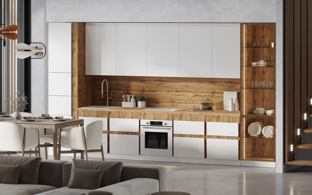Кухня «Аманда» — это современное воплощение уюта и функциональности. Мягкие тона фасадов создают спокойную и комфортную атмосферу, а симметричные детали придают интерьеру структуру и эстетику.