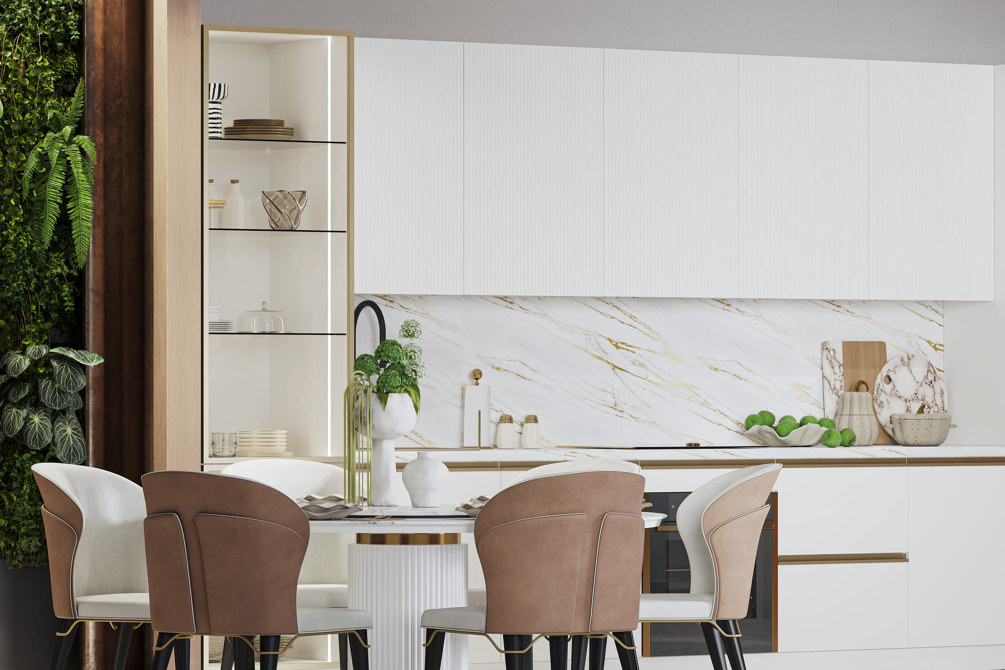 Кухня «Мария» — это чистый, светлый и изысканный интерьер, где классические элементы декора встречаются с современной эстетикой, создавая уникальный баланс между традицией и новаторством.