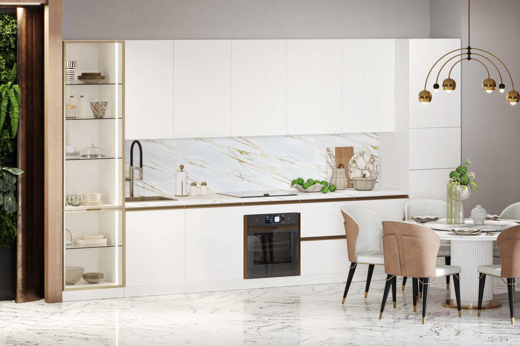 Кухня «Мария» — это чистый, светлый и изысканный интерьер, где классические элементы декора встречаются с современной эстетикой, создавая уникальный баланс между традицией и новаторством.
