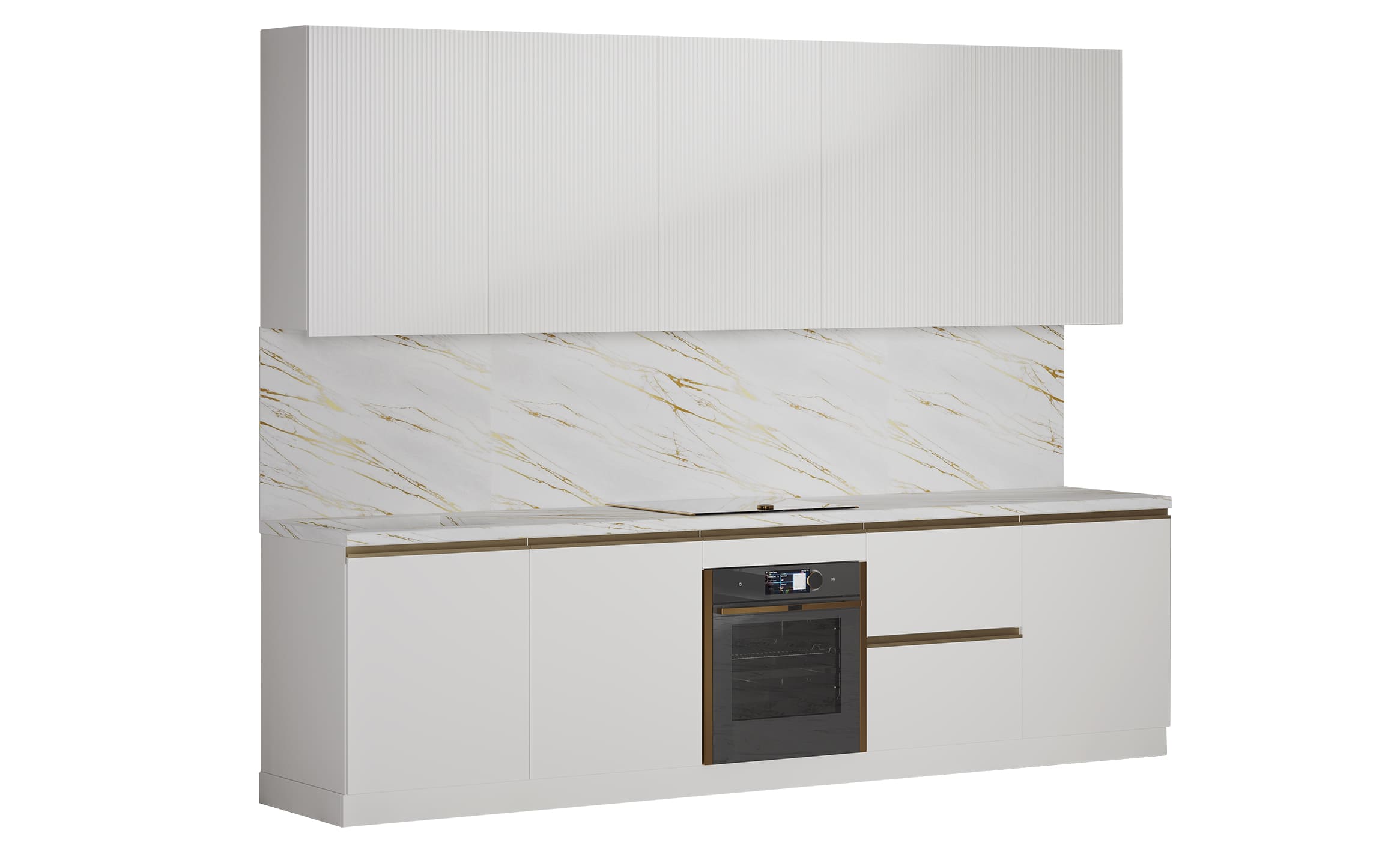 Кухня Мария 2 уровня прямая 4.2 м. (белый/золото/мрамор)