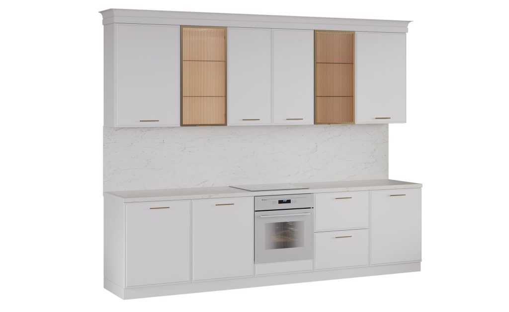 Кухня «Виктория» — это чистый современный стиль с акцентом на текстуры и точность деталей. Рифлёное стекло в тонкой алюминиевой рамке добавляет света и глубины, создавая эффект лёгкости и изысканности.