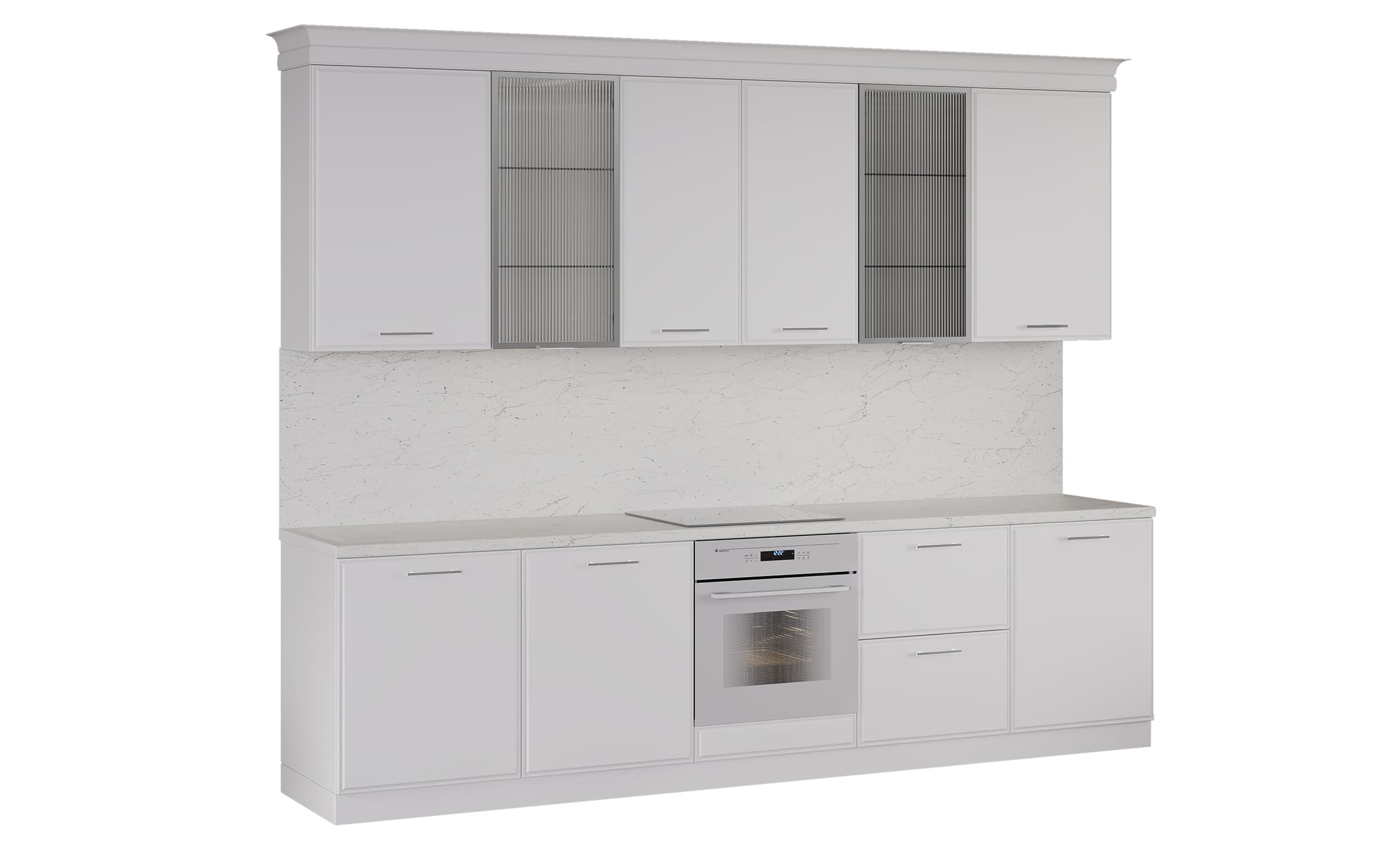 Кухня «Виктория» — это чистый современный стиль с акцентом на текстуры и точность деталей. Рифлёное стекло в тонкой алюминиевой рамке добавляет света и глубины, создавая эффект лёгкости и изысканности.