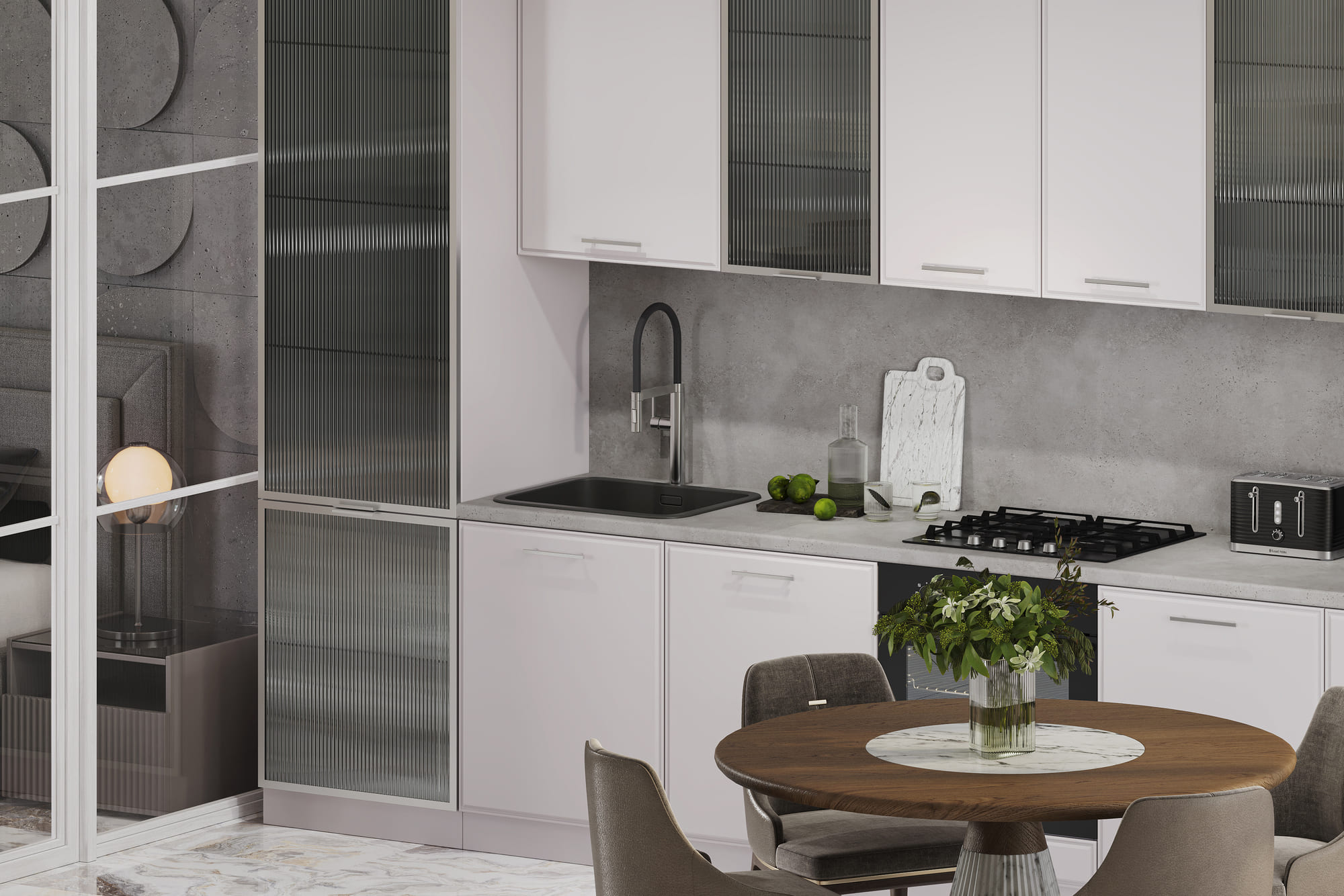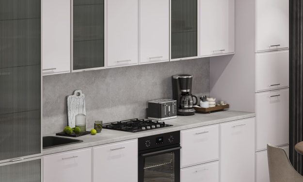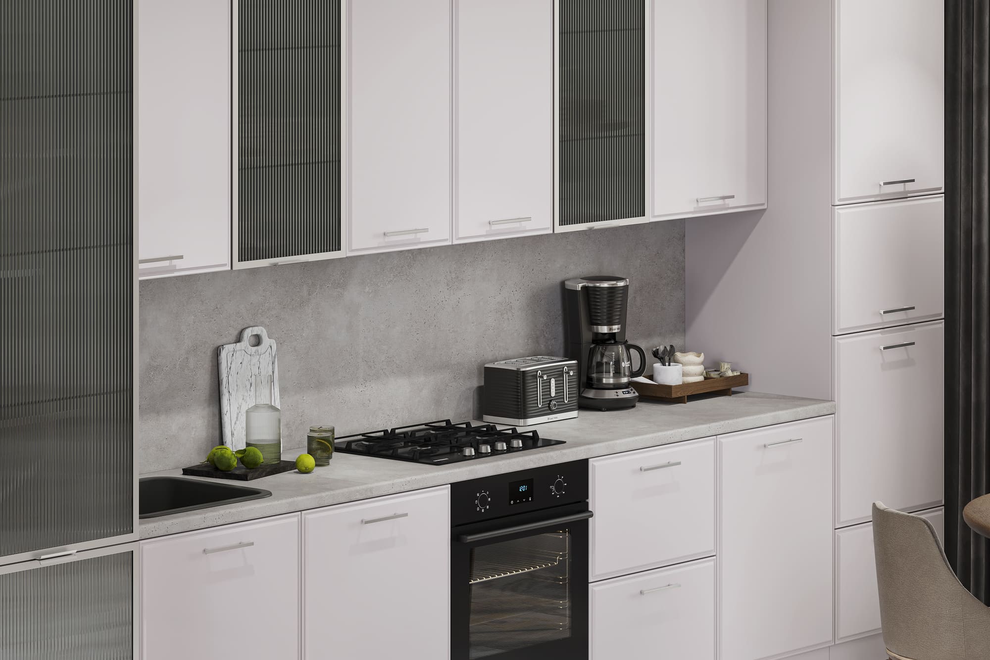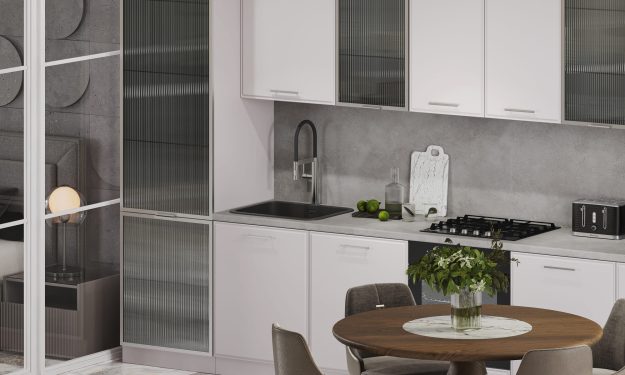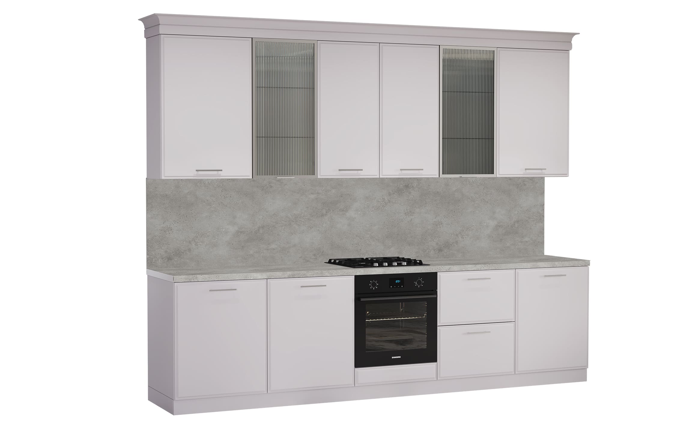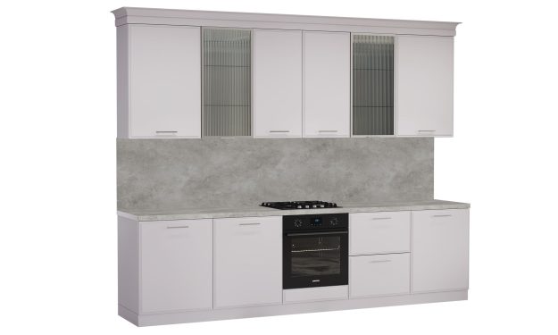 Кухня «Виктория» — это чистый современный стиль с акцентом на текстуры и точность деталей. Рифлёное стекло в тонкой алюминиевой рамке добавляет света и глубины, создавая эффект лёгкости и изысканности.