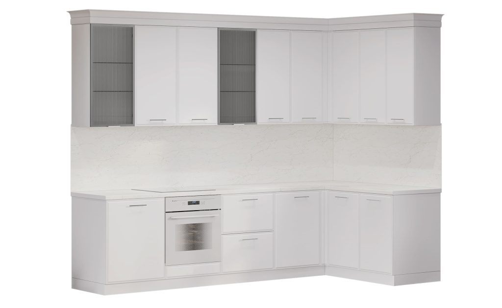 Кухня «Виктория» — это чистый современный стиль с акцентом на текстуры и точность деталей. Рифлёное стекло в тонкой алюминиевой рамке добавляет света и глубины, создавая эффект лёгкости и изысканности.