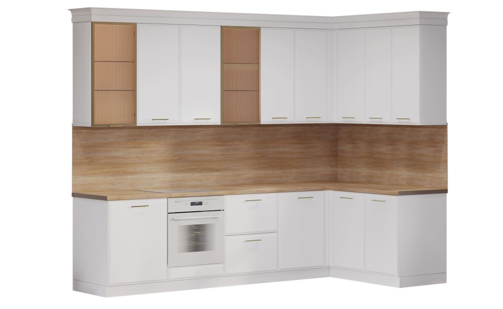Кухня Виктория угловая 3×1.55 м. (белый/золото/дуб)
