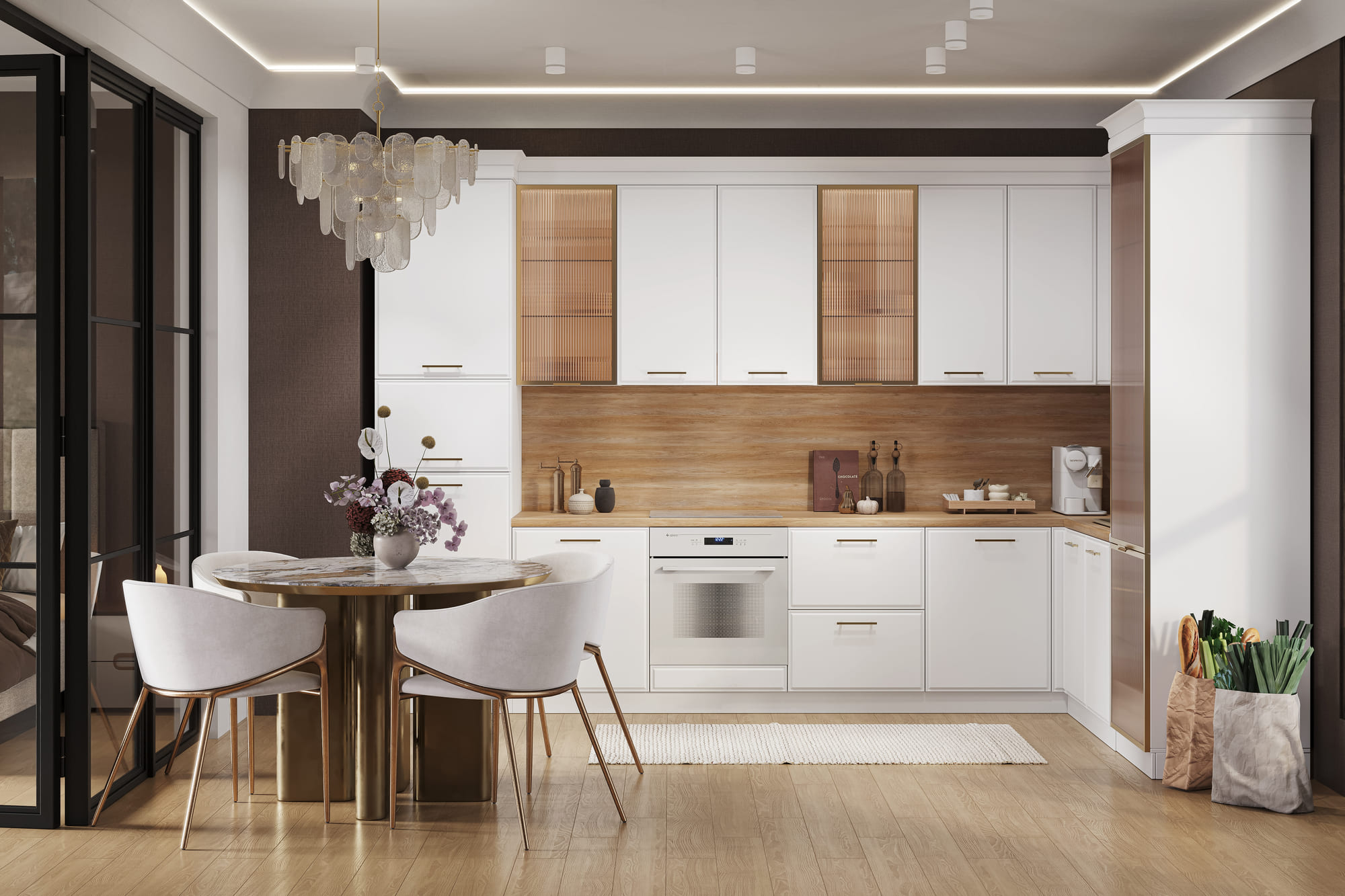 Кухня «Виктория» — это чистый современный стиль с акцентом на текстуры и точность деталей. Рифлёное стекло в тонкой алюминиевой рамке добавляет света и глубины, создавая эффект лёгкости и изысканности.