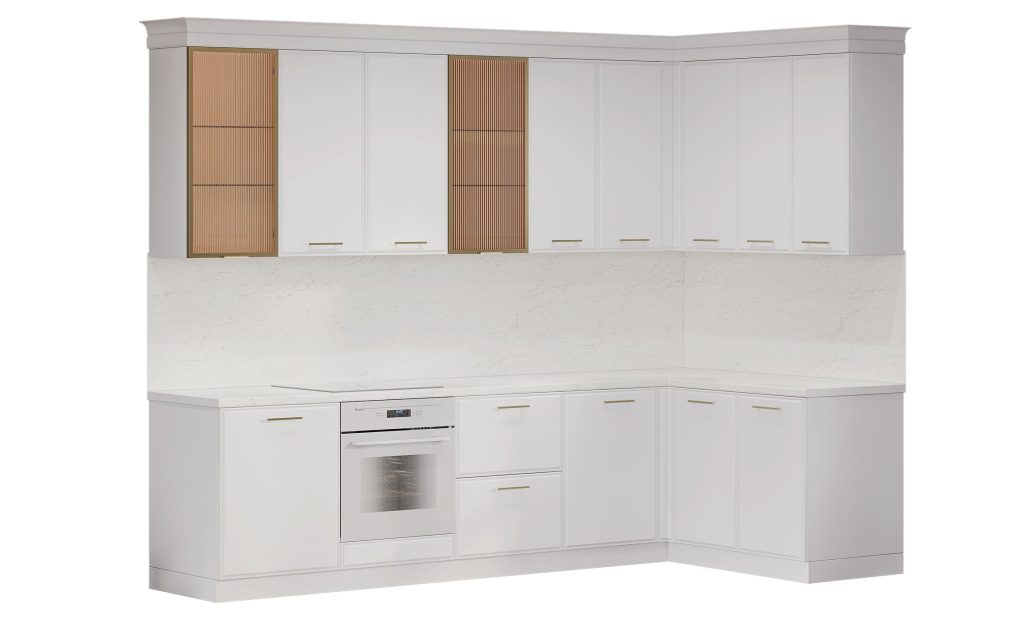Кухня «Виктория» — это чистый современный стиль с акцентом на текстуры и точность деталей. Рифлёное стекло в тонкой алюминиевой рамке добавляет света и глубины, создавая эффект лёгкости и изысканности.