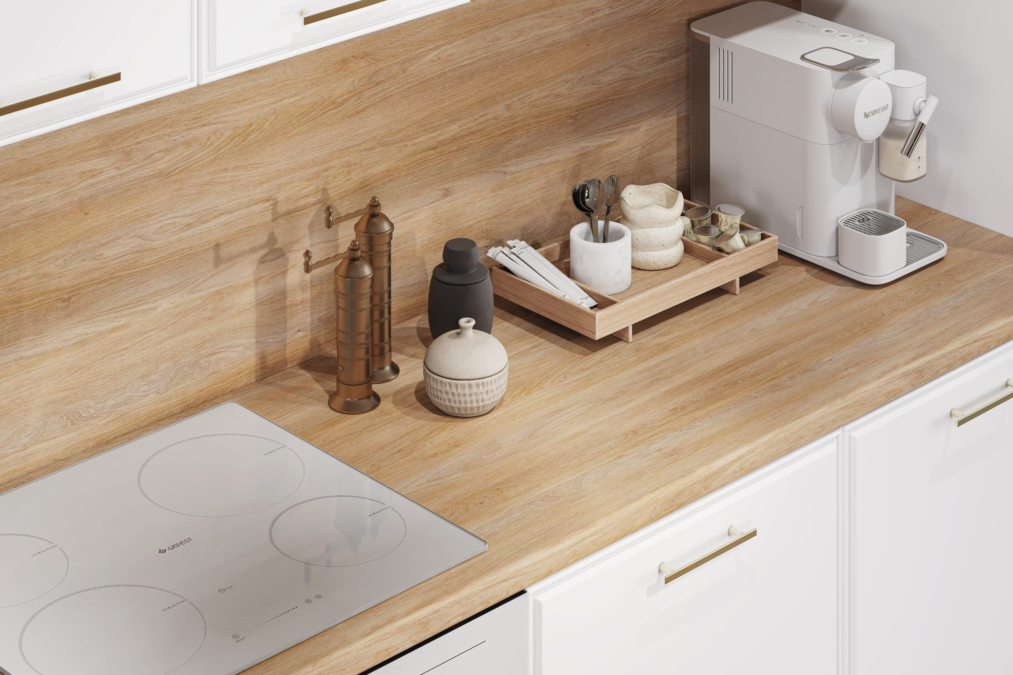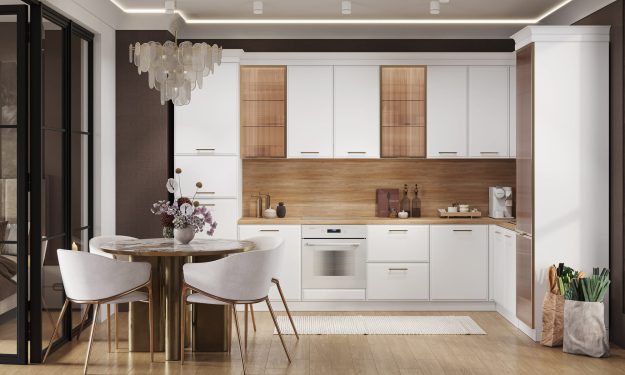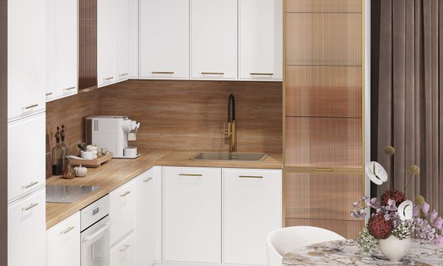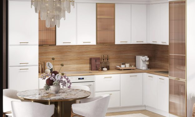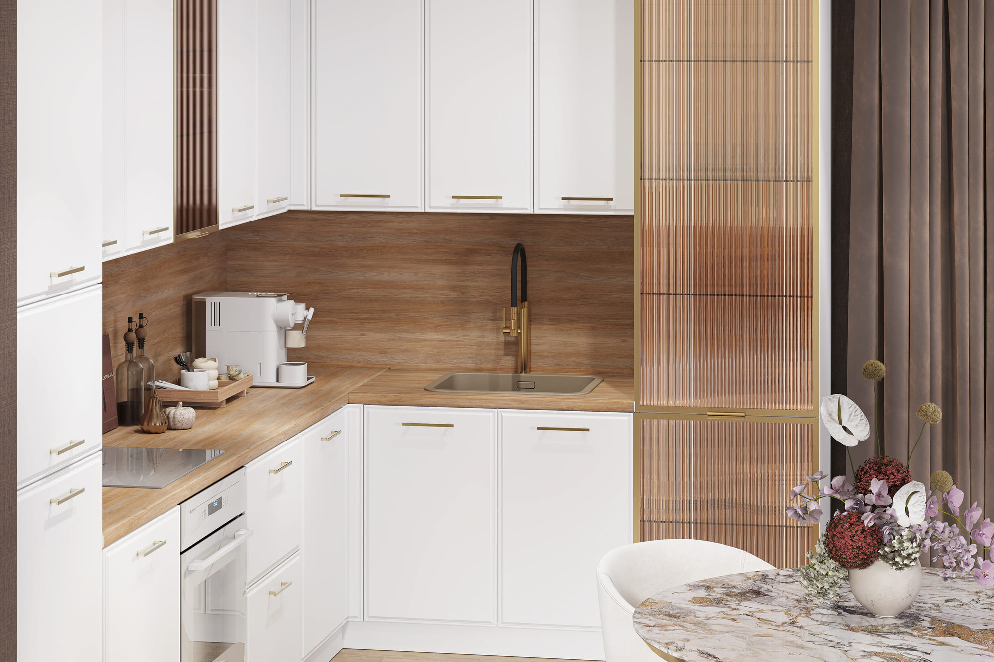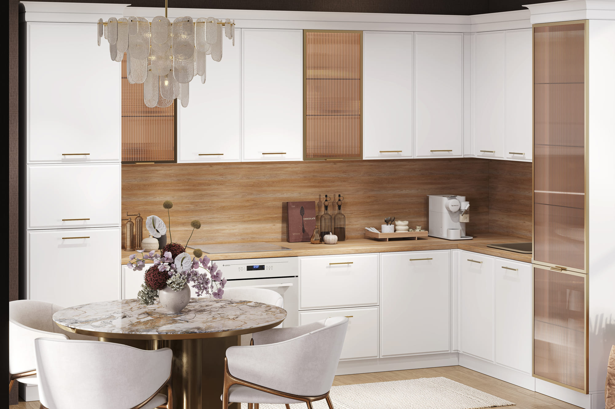 Кухня «Виктория» — это чистый современный стиль с акцентом на текстуры и точность деталей. Рифлёное стекло в тонкой алюминиевой рамке добавляет света и глубины, создавая эффект лёгкости и изысканности.