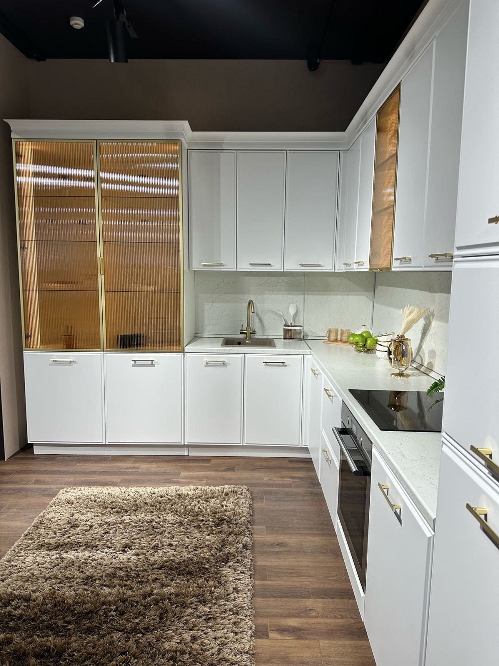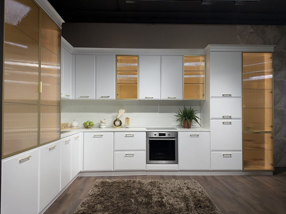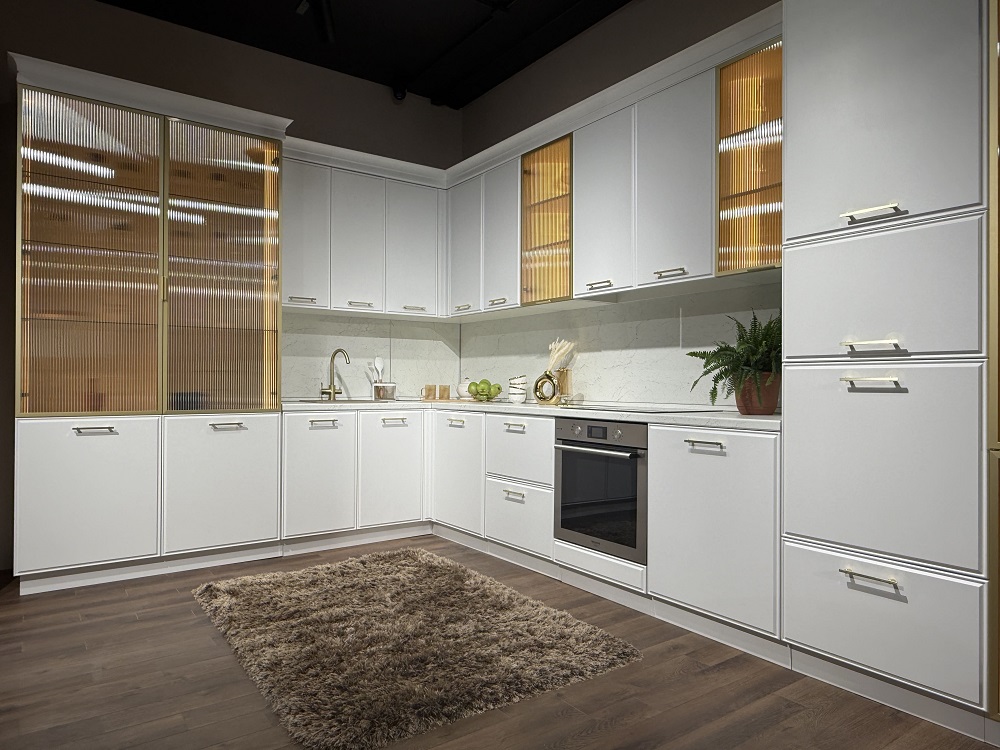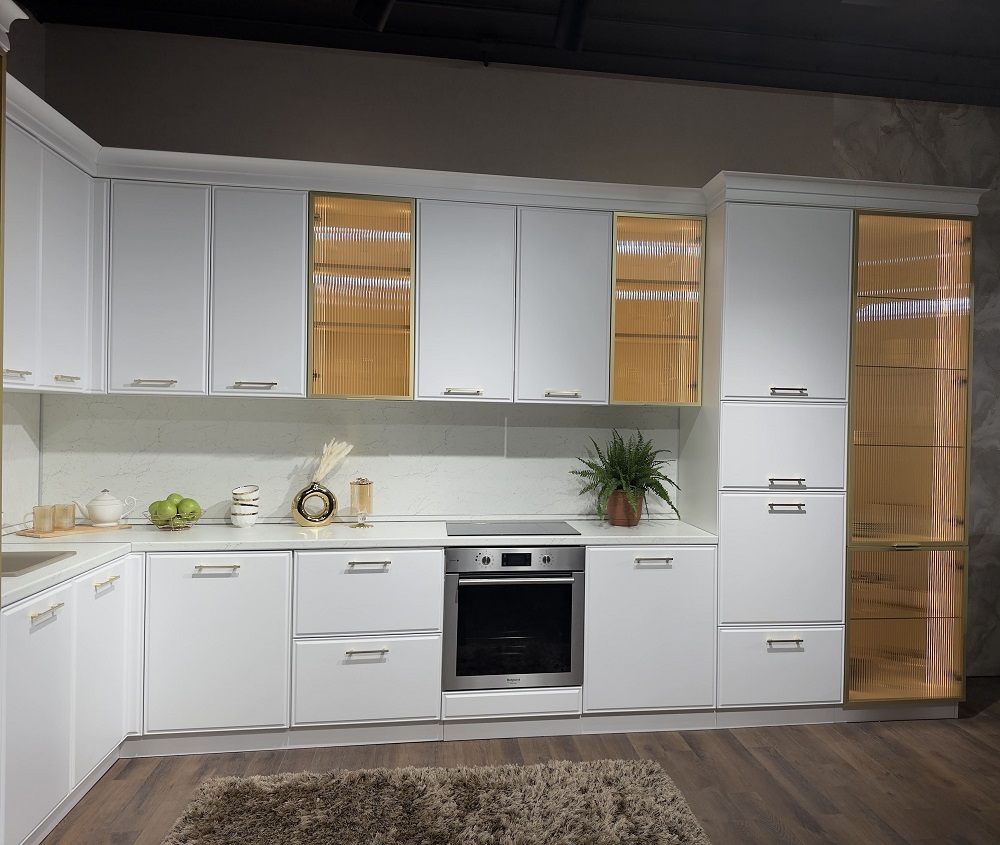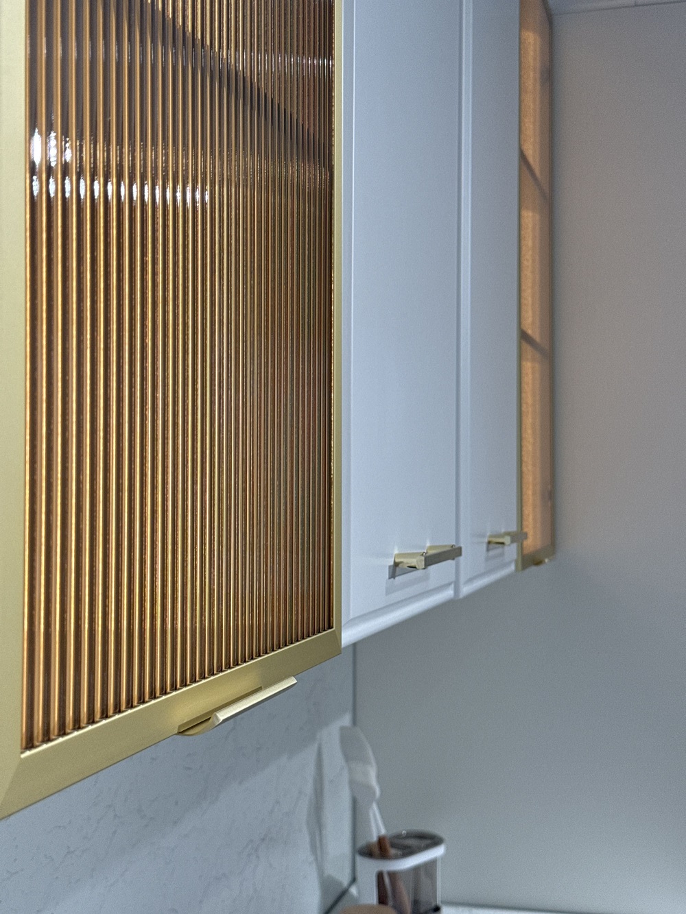 Кухня «Виктория» — это чистый современный стиль с акцентом на текстуры и точность деталей. Рифлёное стекло в тонкой алюминиевой рамке добавляет света и глубины, создавая эффект лёгкости и изысканности.