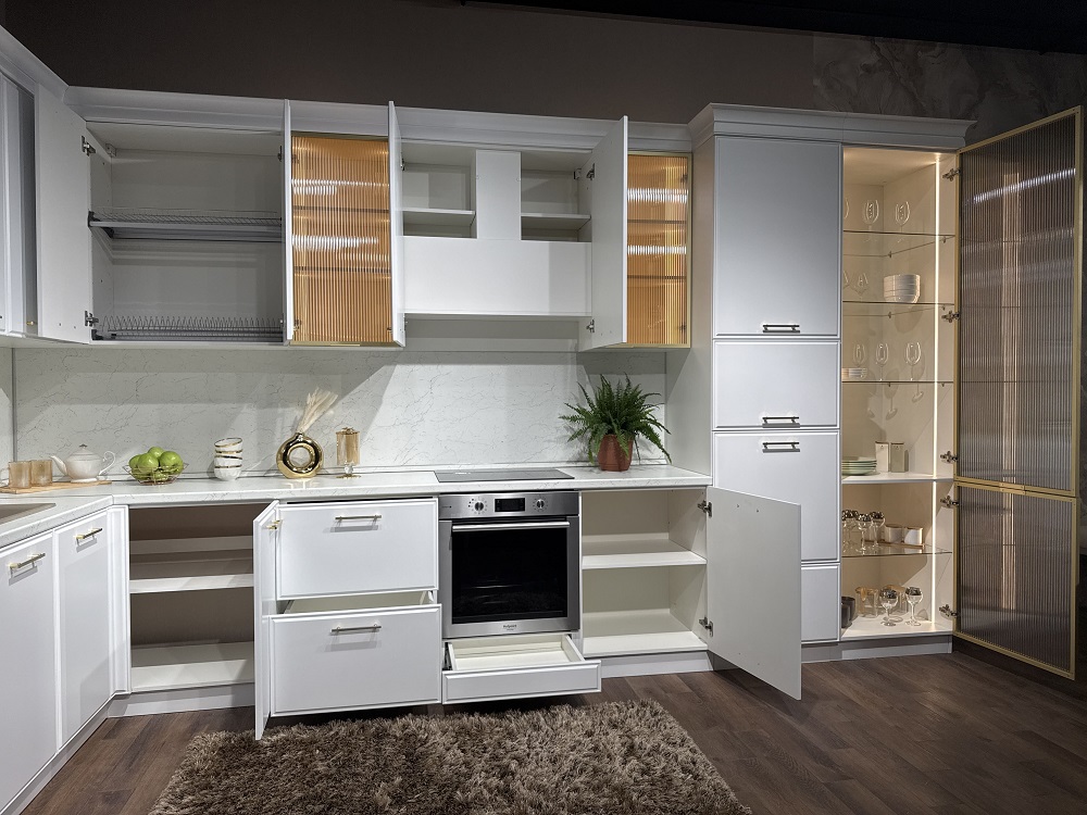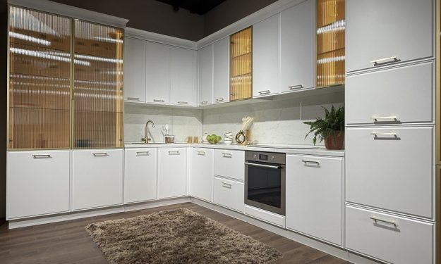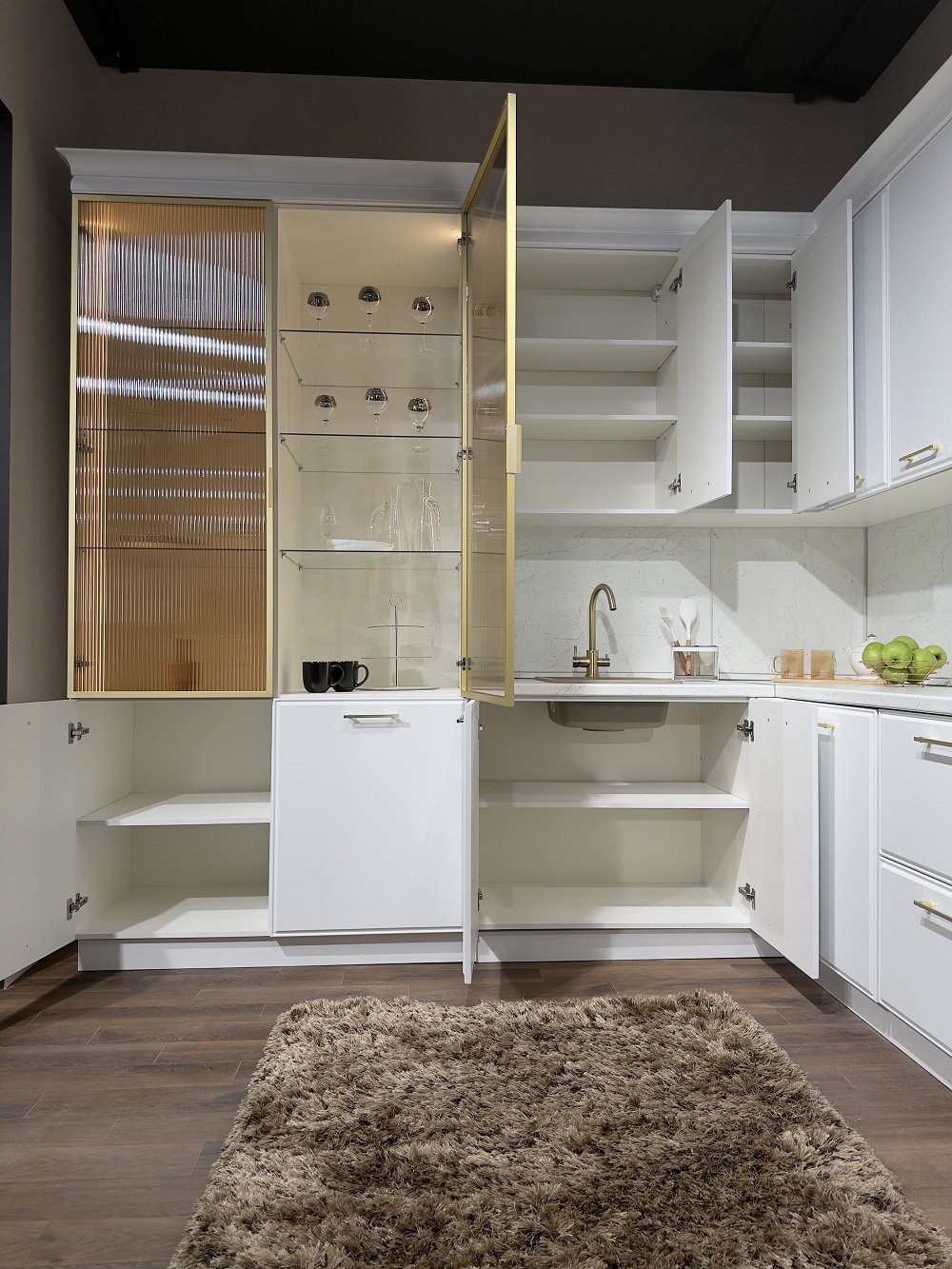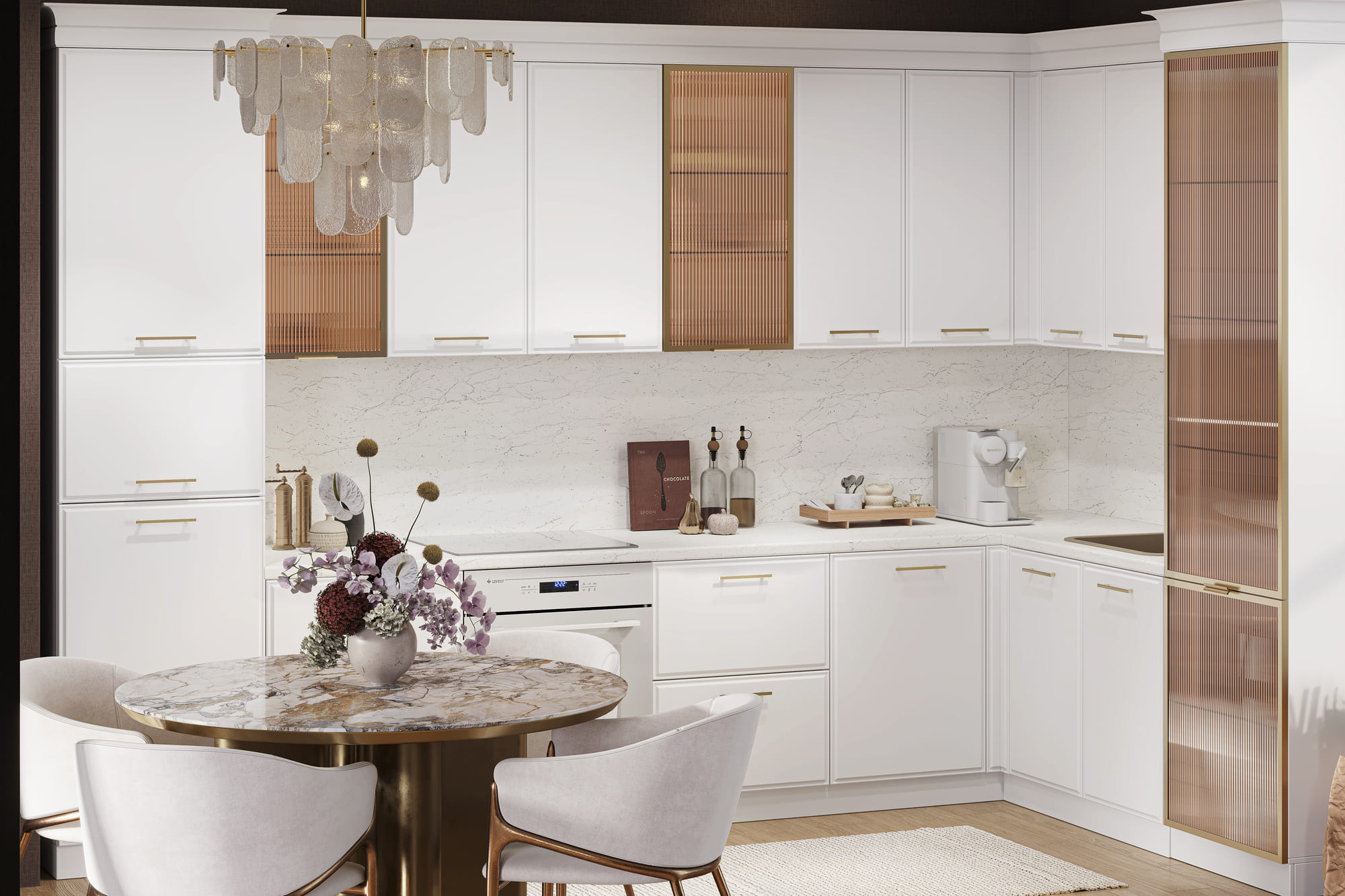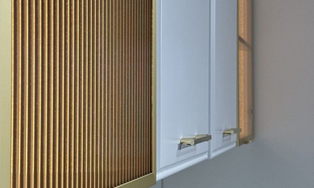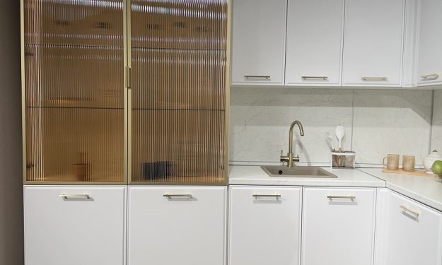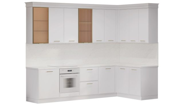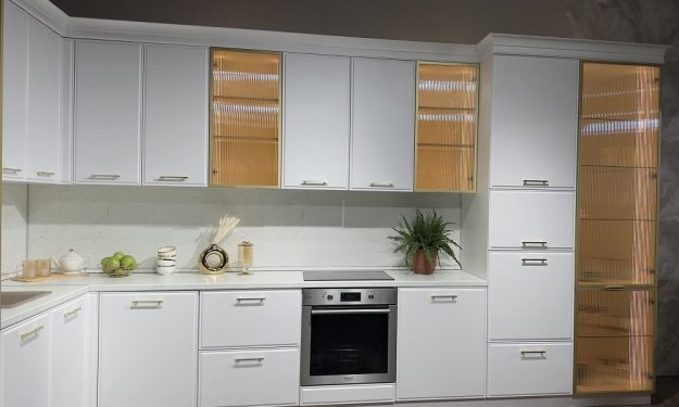 Кухня «Виктория» — это чистый современный стиль с акцентом на текстуры и точность деталей. Рифлёное стекло в тонкой алюминиевой рамке добавляет света и глубины, создавая эффект лёгкости и изысканности.