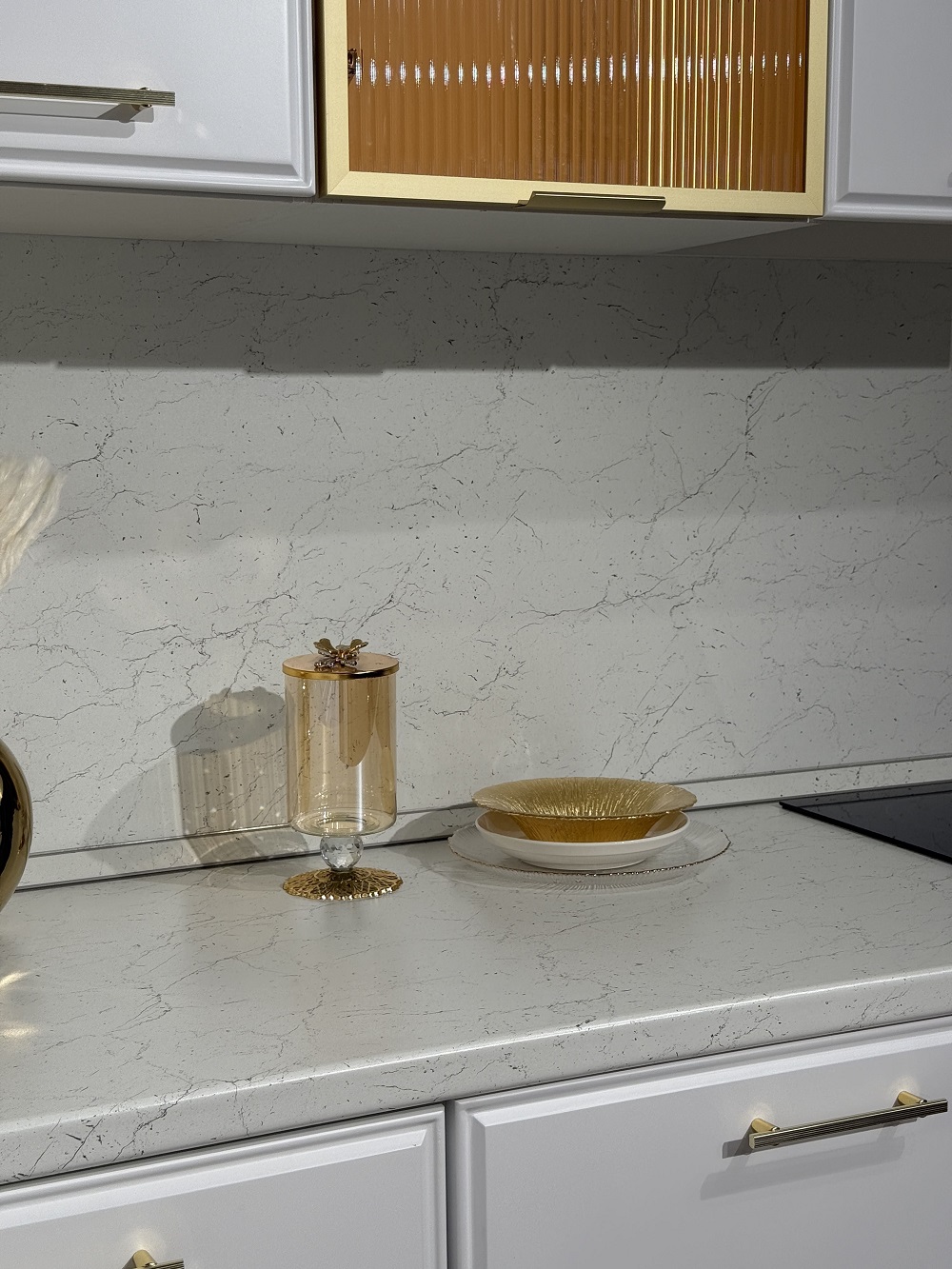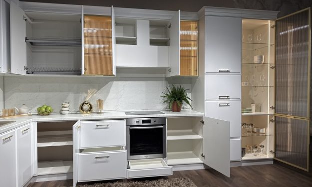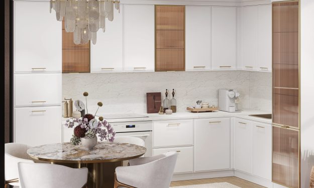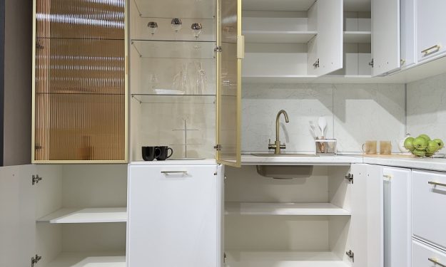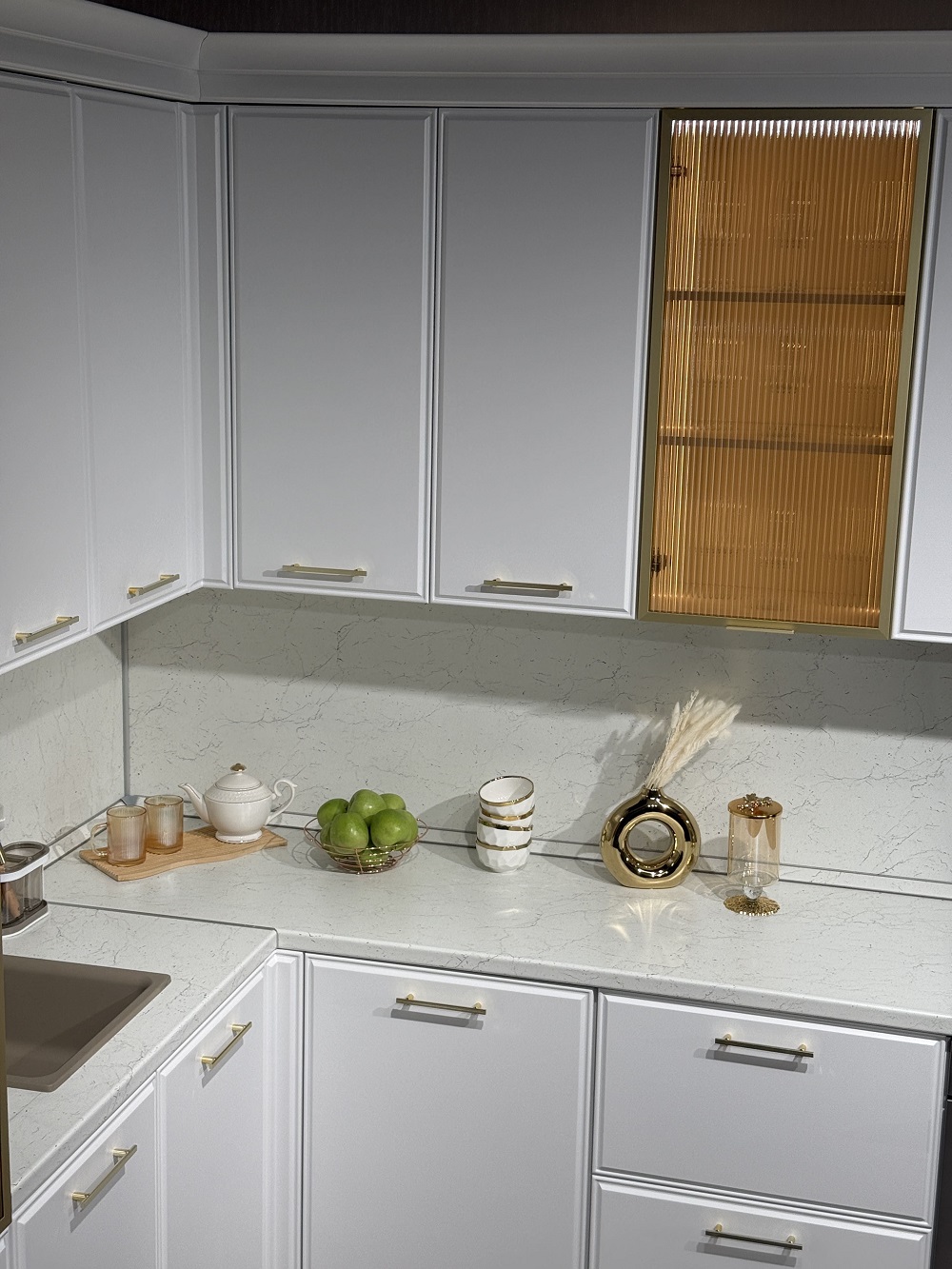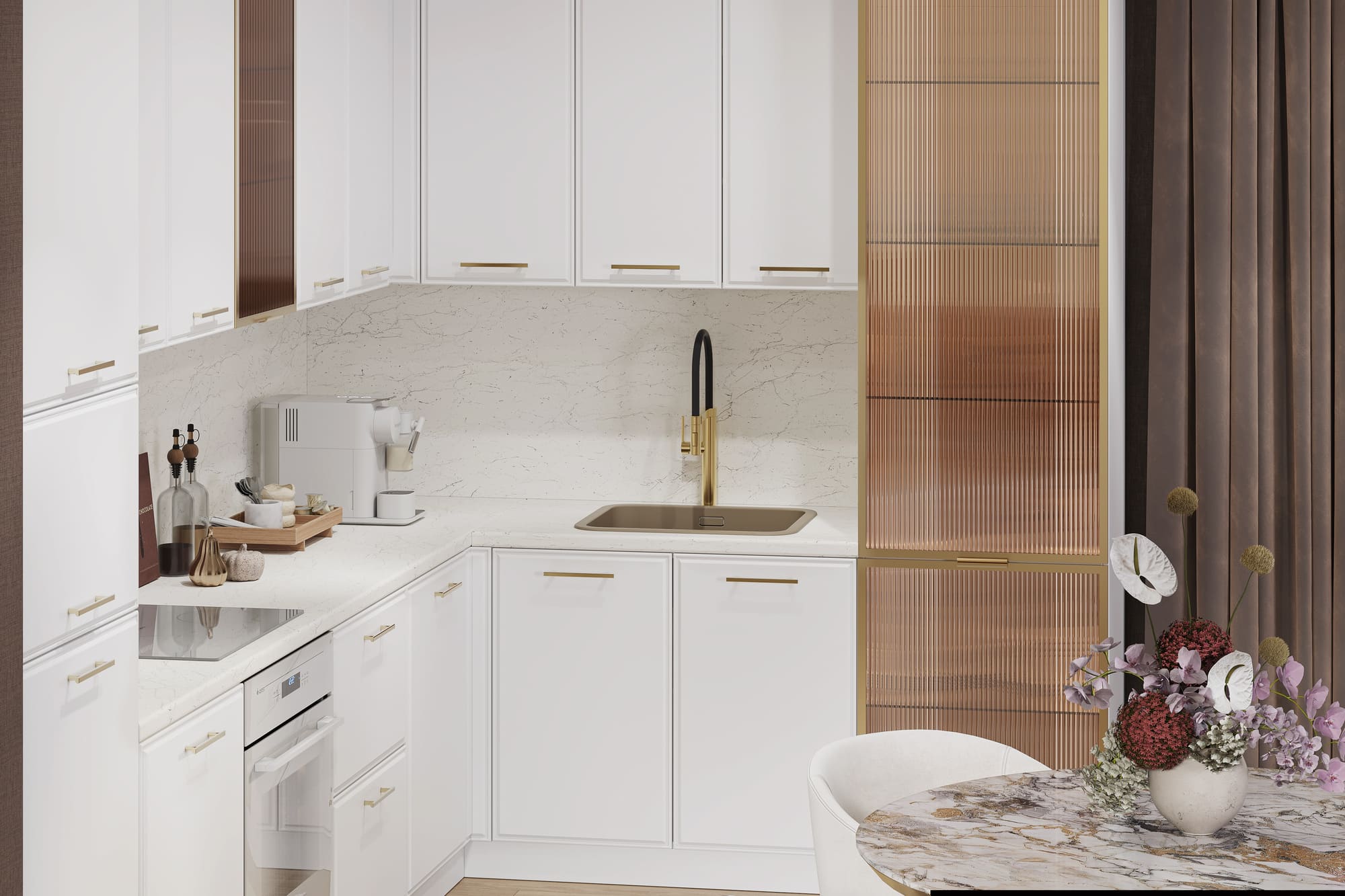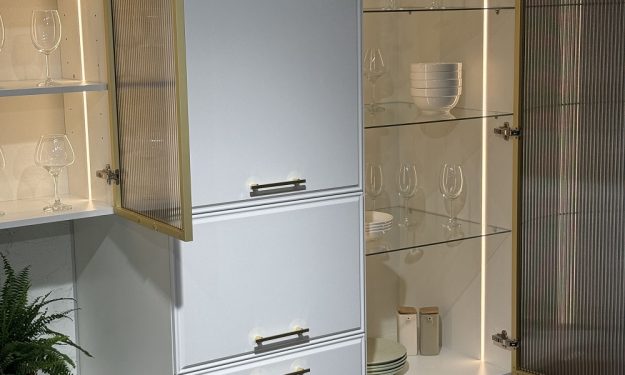 Кухня «Виктория» — это чистый современный стиль с акцентом на текстуры и точность деталей. Рифлёное стекло в тонкой алюминиевой рамке добавляет света и глубины, создавая эффект лёгкости и изысканности.