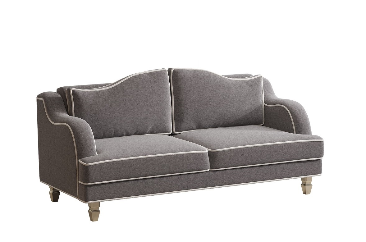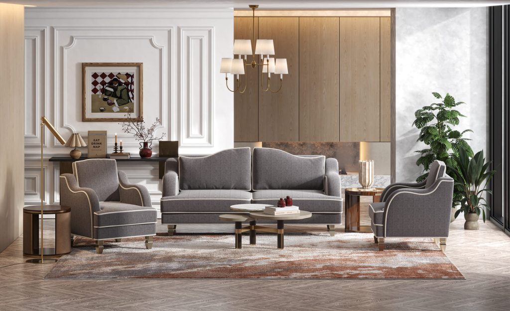 Набор мягкой мебели «Лаура» воплощает неоклассику с уютной теплотой: плавные изгибы формы и мягкие приспинные подушки создают ощущение комфорта, а ткань рогожка серо-бежевого оттенка придаёт интерьеру натуральную, тактильную глубину — без излишней пафосности, с лёгкой элегантностью, которая не требует слов.