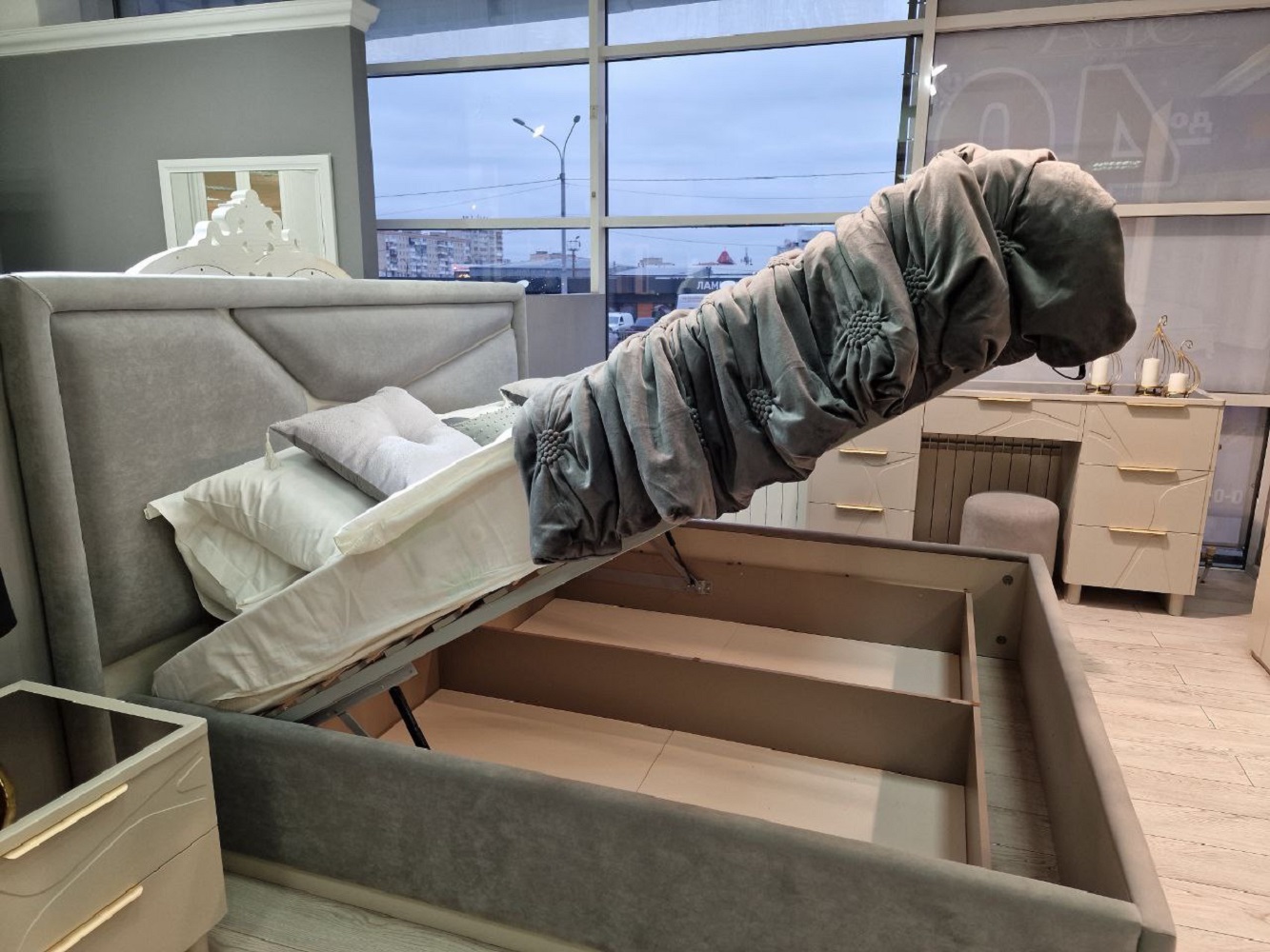 Основание-короб с подъемным механизмом и ящиком для хранения. Идеально подойдет для создания дополнительного пространства для хранения белья и вещей.