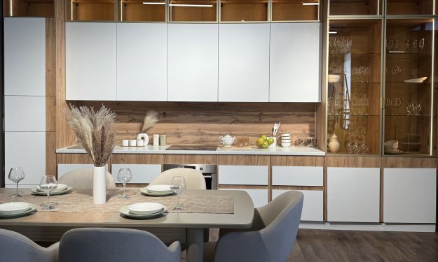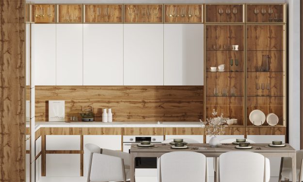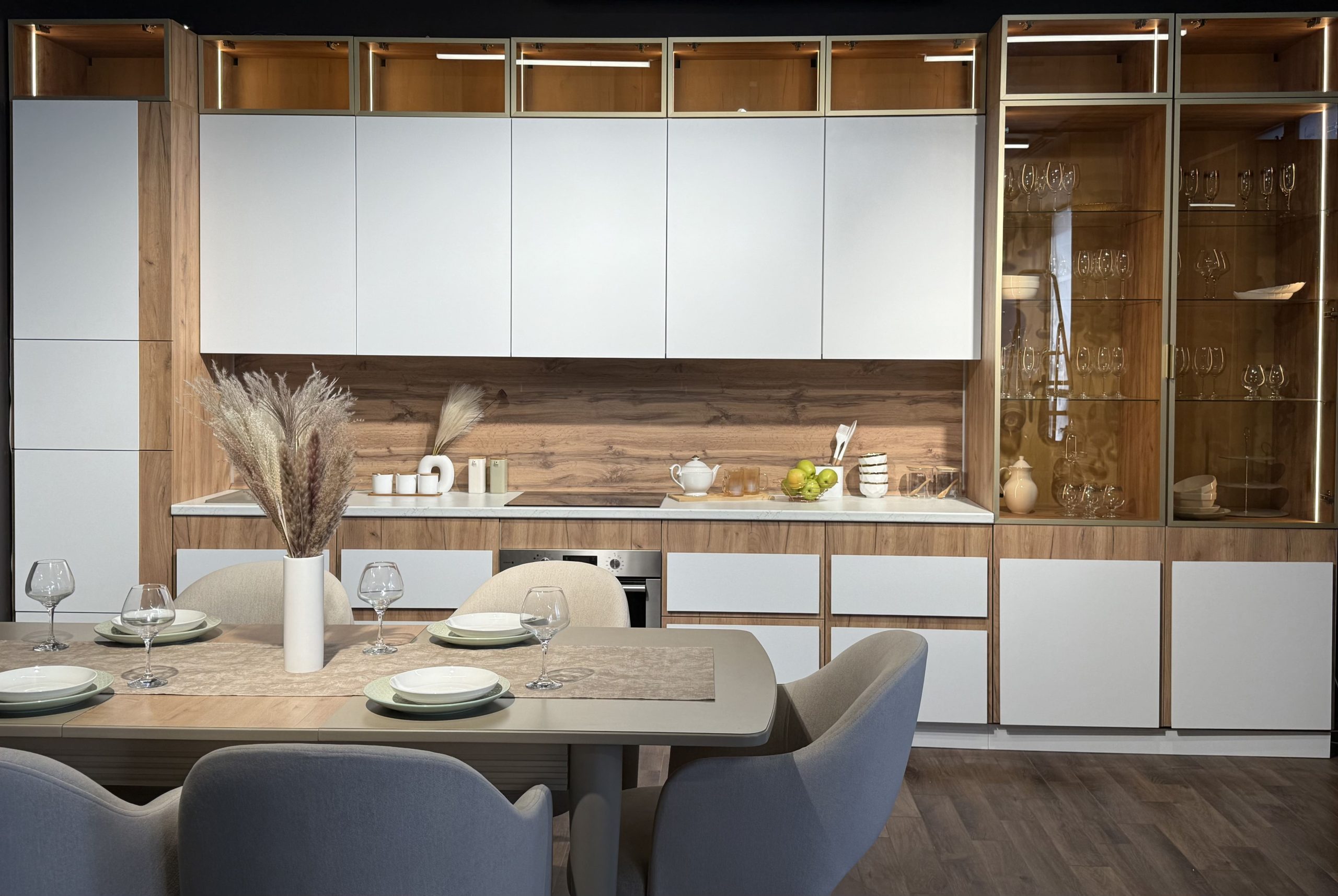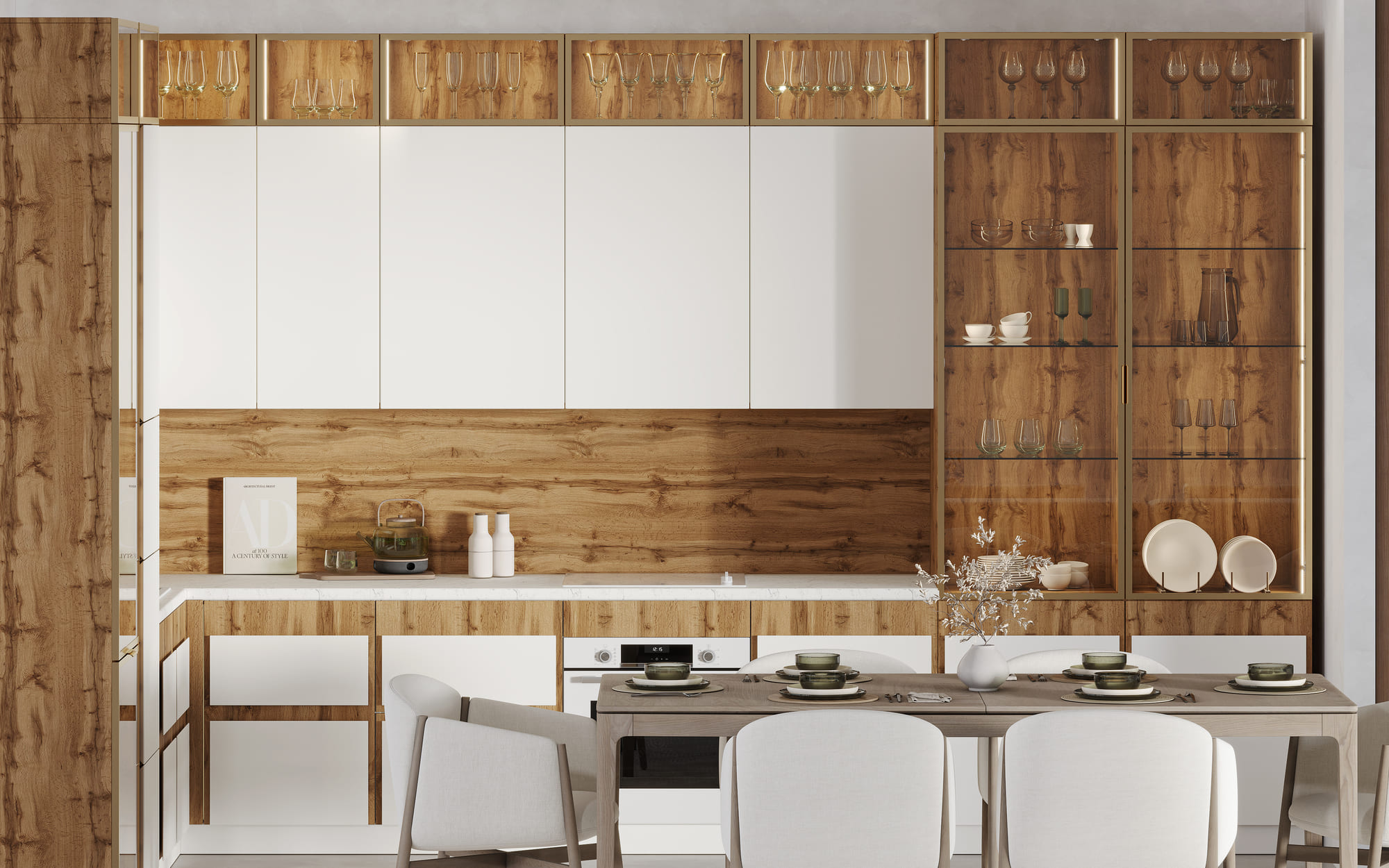 Кухонный пенал «Аманда» остеклённый с алюминиевой рамкой золотого цвета — стильное и функциональное решение для кухни. Обеспечивает защиту от пыли и сохраняет эстетику интерьера.