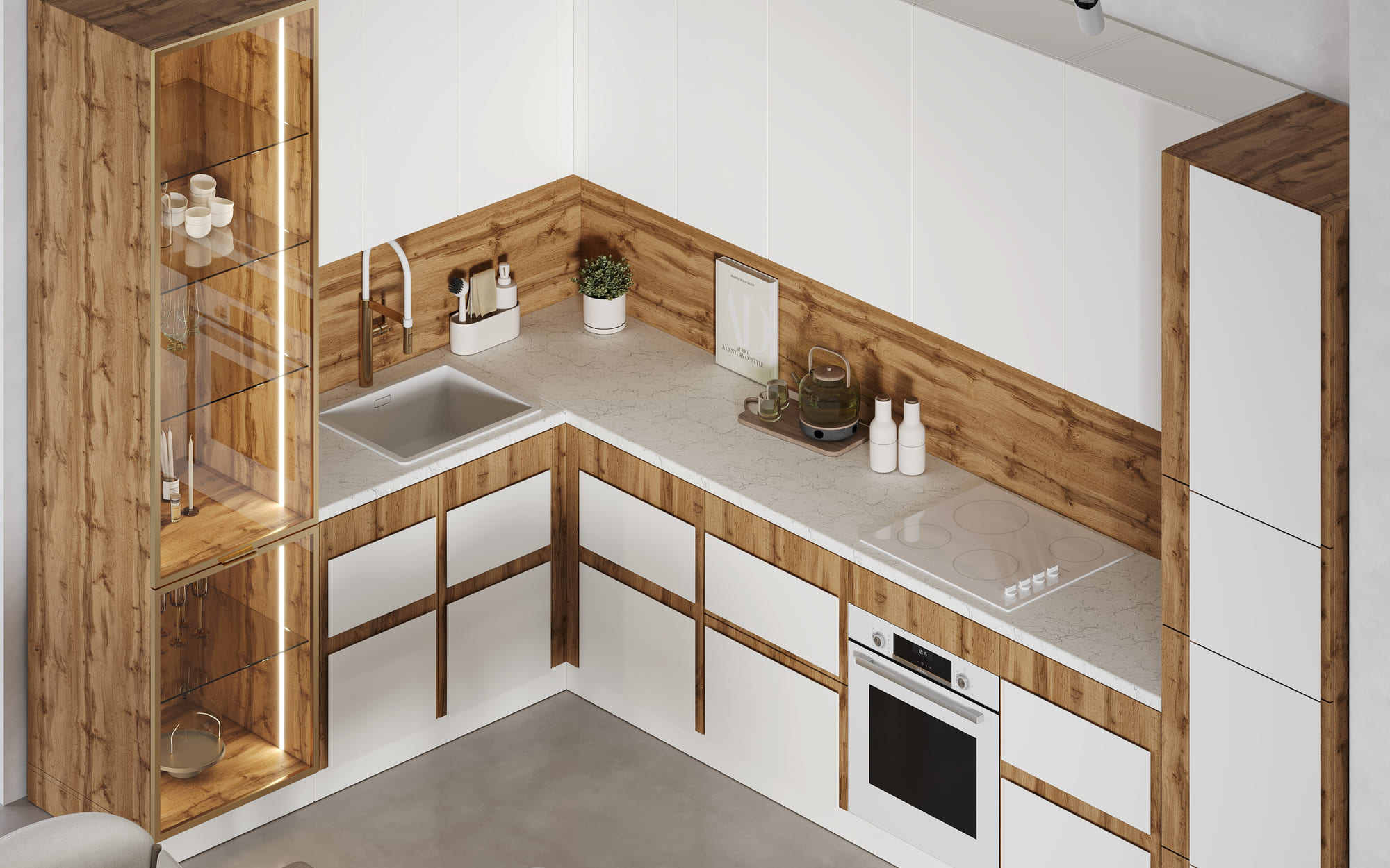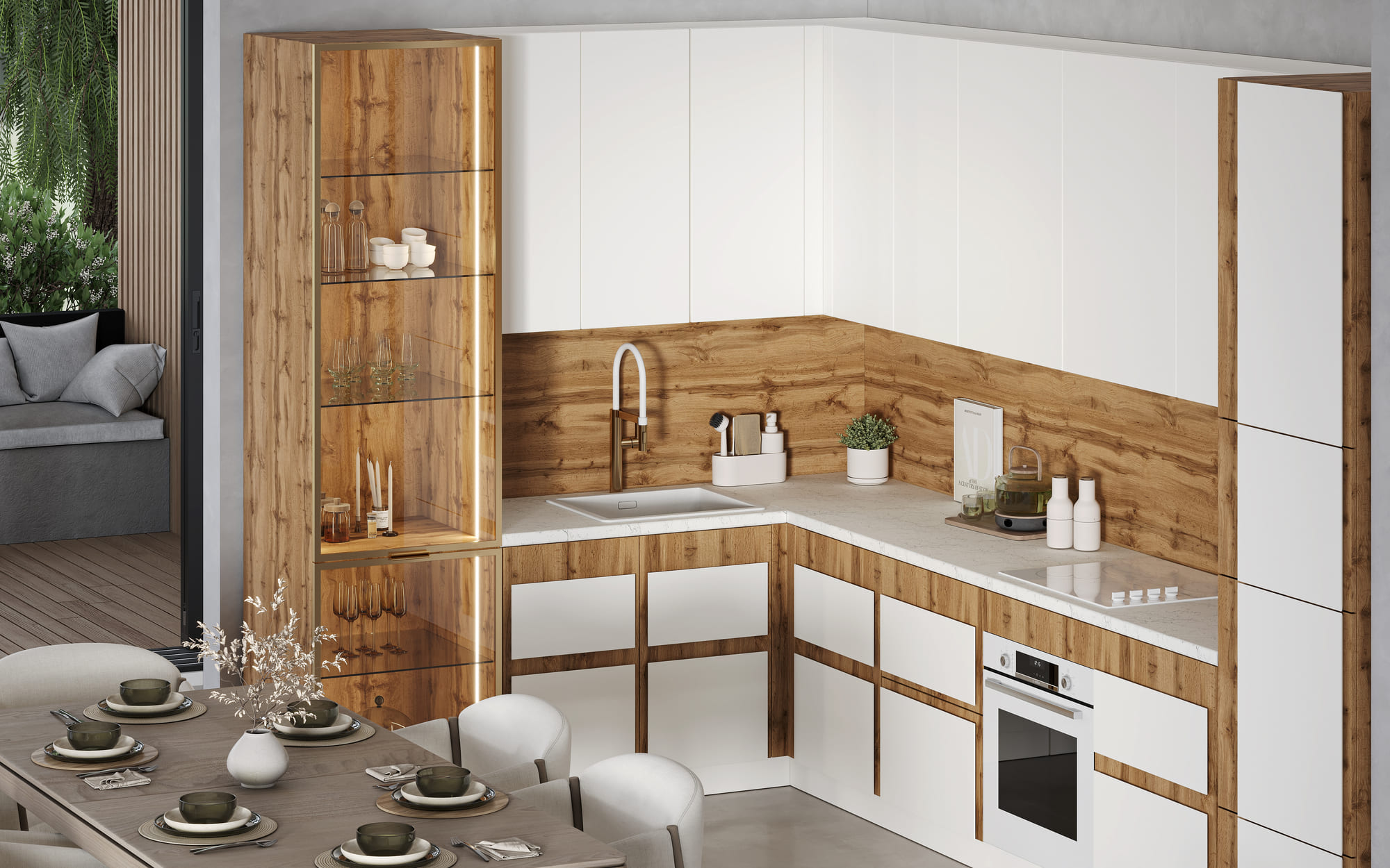 Кухонный пенал «Аманда» остеклённый с алюминиевой рамкой золотого цвета — стильное и функциональное решение для кухни. Обеспечивает защиту от пыли и сохраняет эстетику интерьера.
