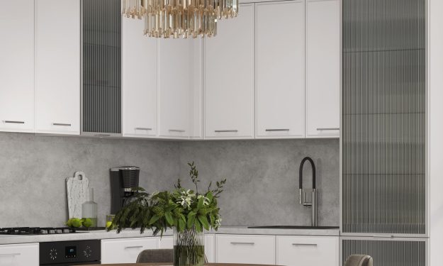 Кухонный пенал «Виктория» с рифлёным стеклом в алюминиевой рамке — это логичное продолжение стилистики коллекции.