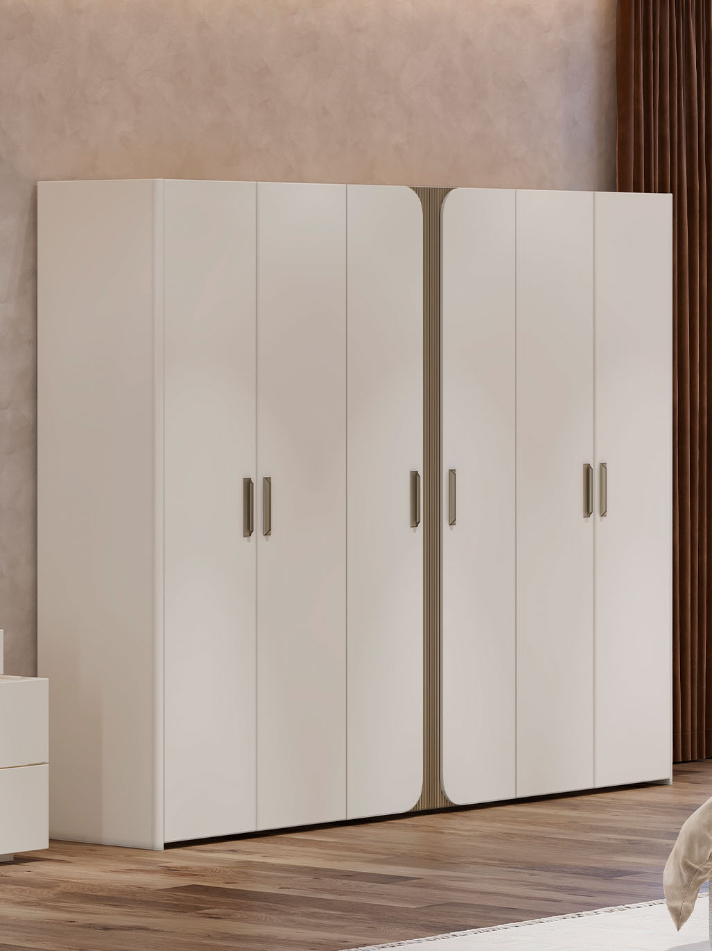 Изящные дверцы из МДФ с закруглением идеально дополняются стеклянными фасадами, встроенными в тонкую алюминиевую рамку. Такое решение придаёт шкафу лёгкость и элегантность, делая его по-настоящему универсальным для любого интерьера.