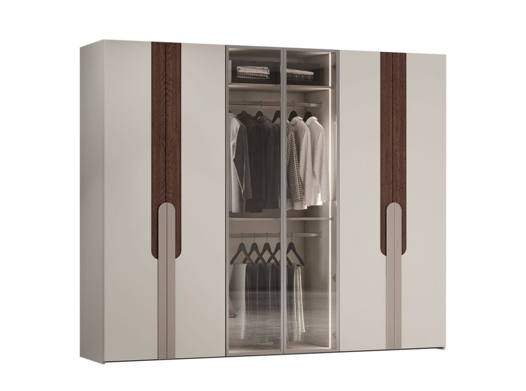 Шкаф 6-ти дверный остеклённый «Диана» — это стильное и функциональное решение для вашего интерьера, сочетающее современные материалы и изысканный дизайн. Фасады шкафа выполнены со стеклом в алюминиевой рамке, что придает мебели современный и легкий вид.