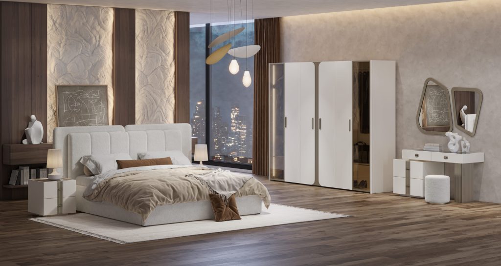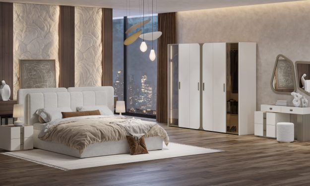 Спальный гарнитур «Леонардо» выполнен с обивкой из шенилла букле молочного цвета, что придает мебели мягкость и элегантность. Тонированное стекло в алюминиевой рамке добавляет современный акцент и придает мебели легкость и воздушность.