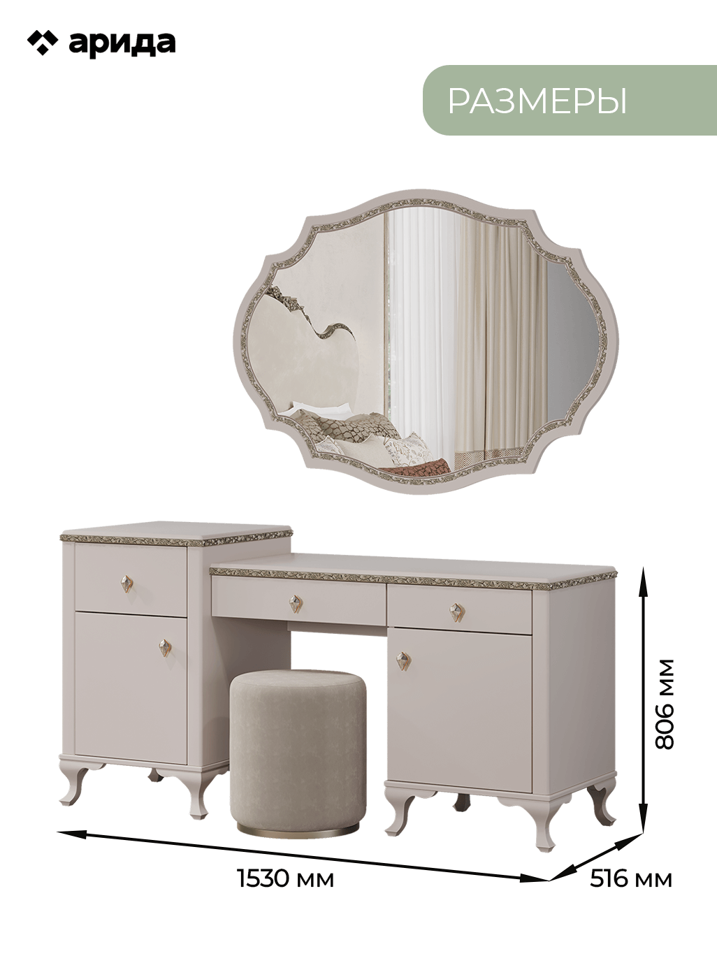 - Стол туалетный: 1530(Ш)х516(Г)х806(В)