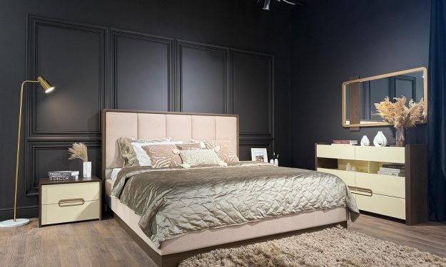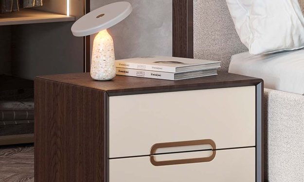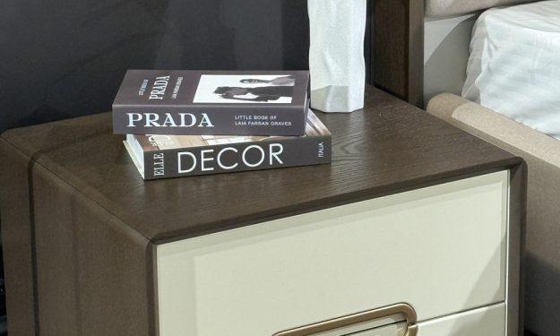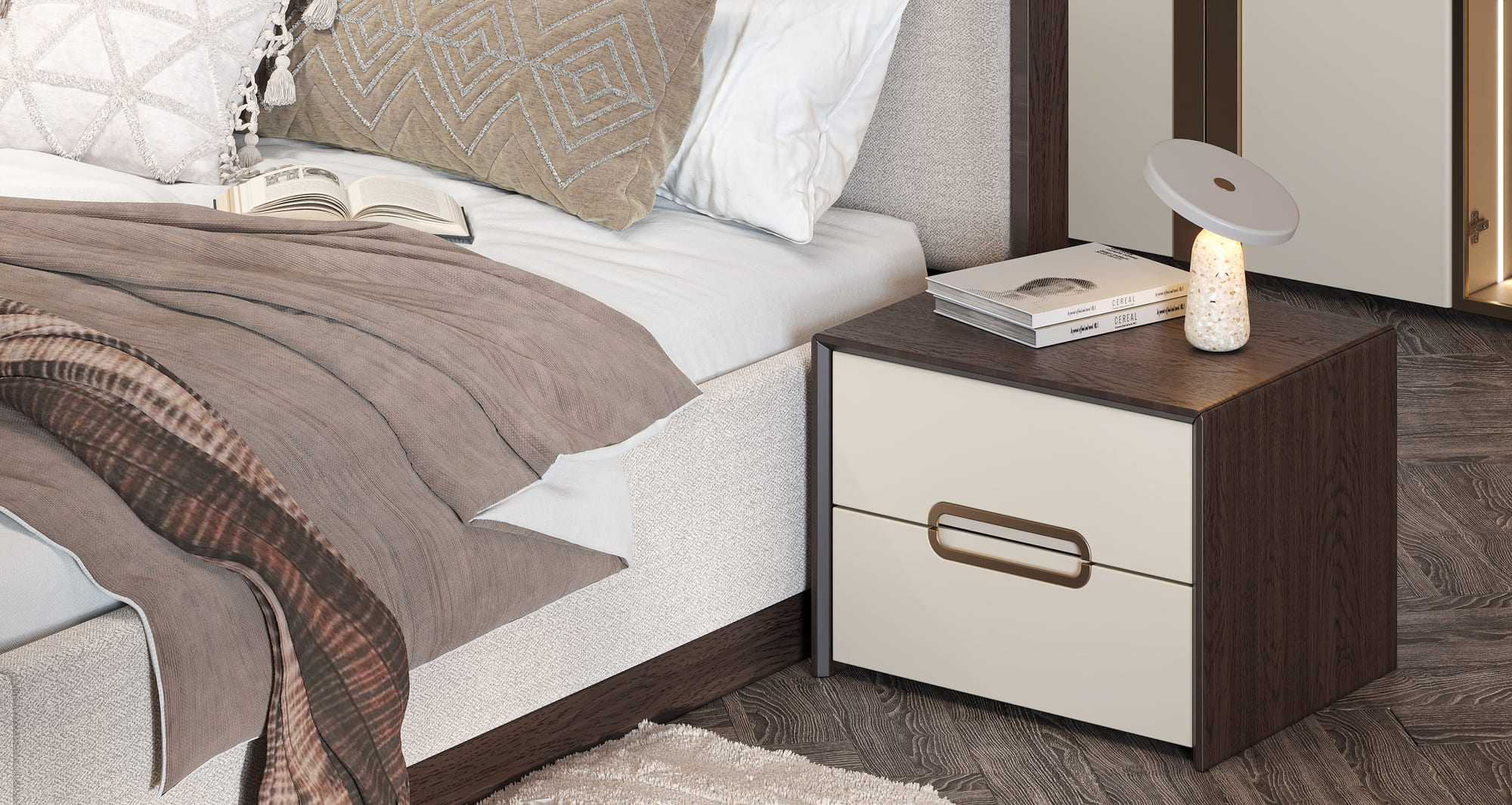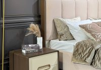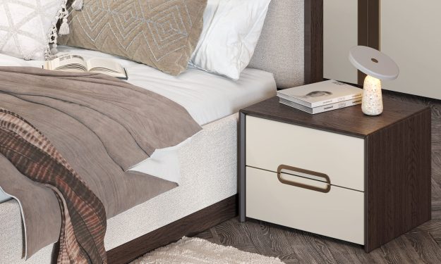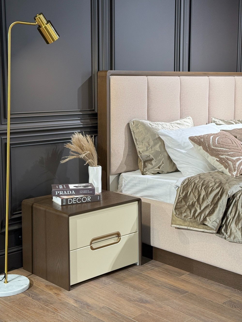 Тумба прикроватная «Диана» выполнена в едином стиле с кроватью и зеркалом — мягкие формы, натуральные текстуры и тонкая детализация.