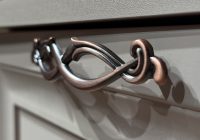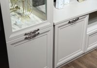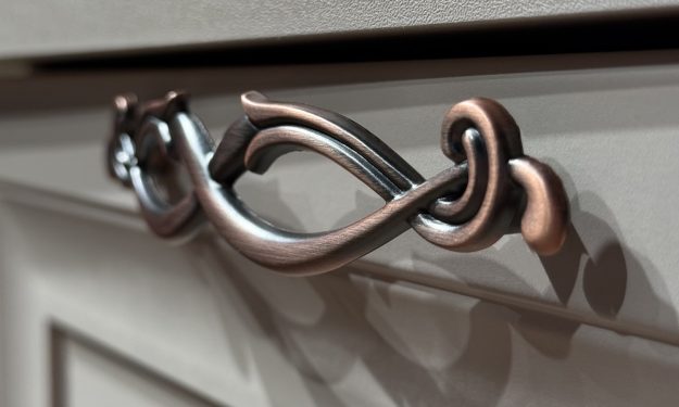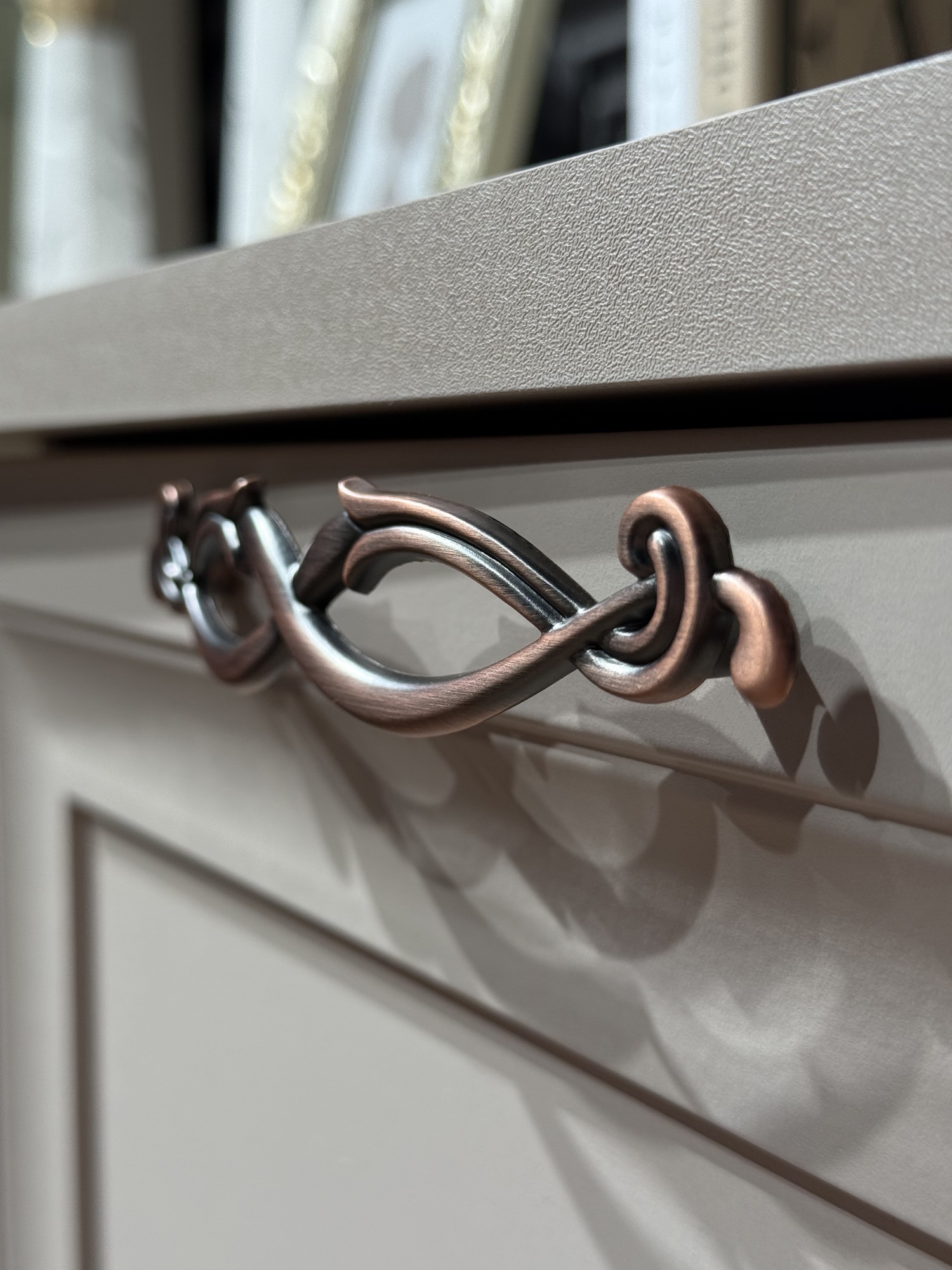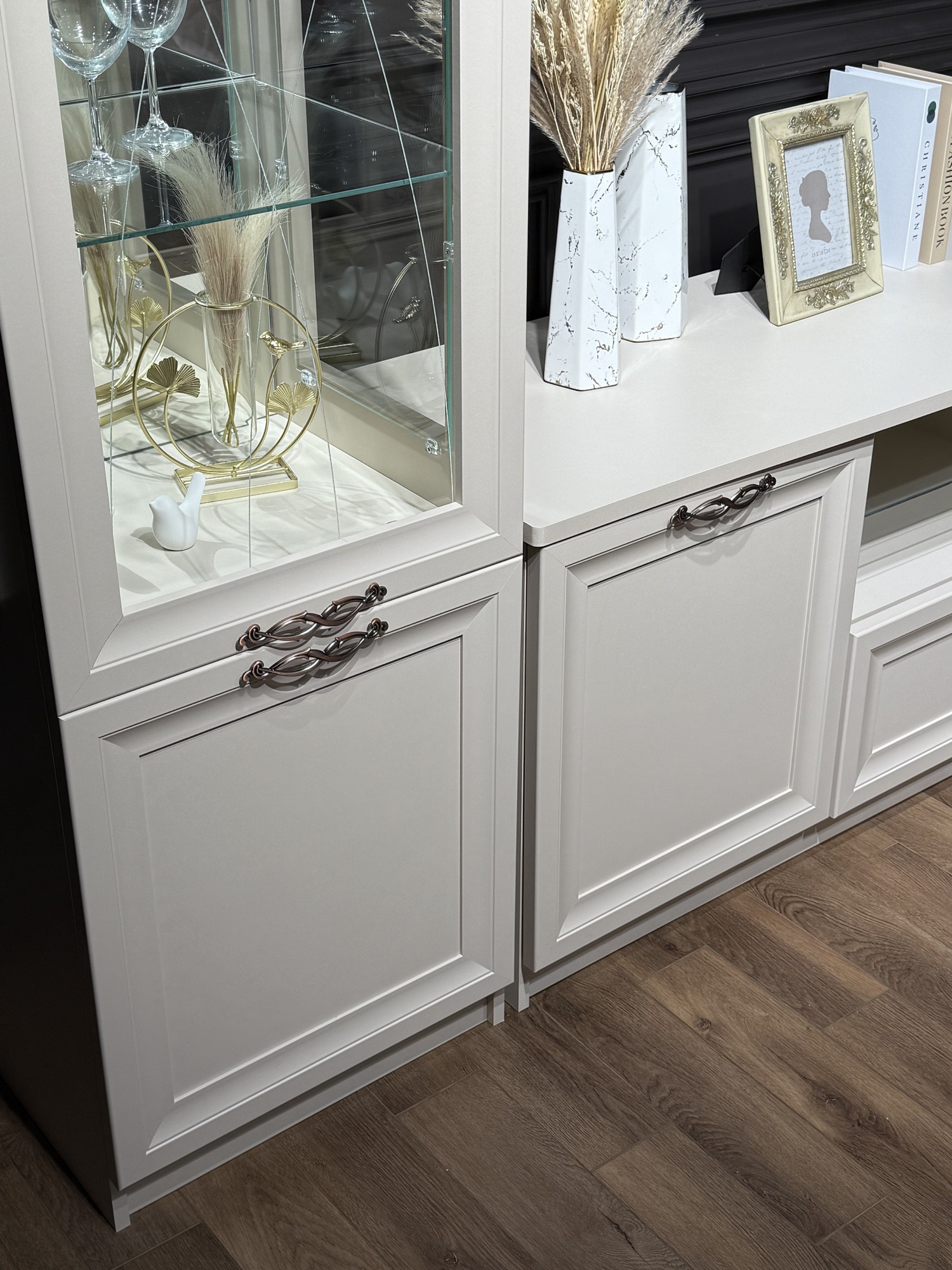 Зеркальная задняя стенка. Боковые фасады с остеклением. Узор на стеклянных фасадах. Ручки из металла (медь).